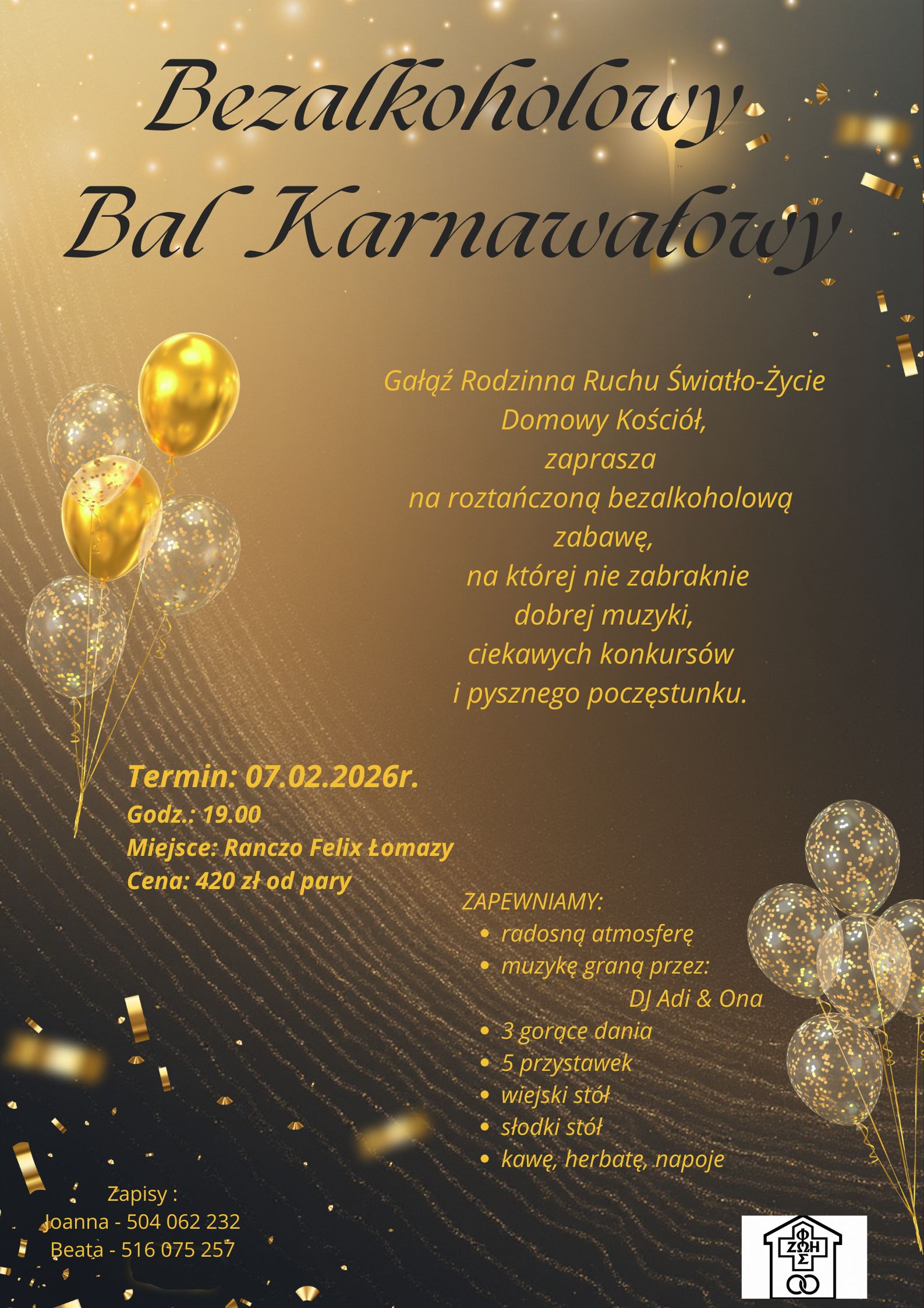 Zapisy na bal prowadzi para rejonowa Domowego Kościoła:Joanna – tel. 504 062 232