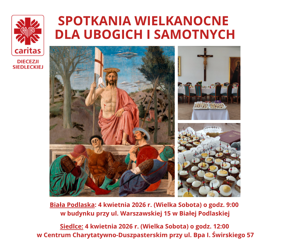 Jak co roku, Caritas Diecezji Siedleckiej przygotowuje dla wszystkich potrzebujących Spotkania Wielkanocne. Odbędą się one 4 kwietnia przy ul. Warszawskiej 15 w Białej Podlaskiej oraz w Centrum Charytatywno-Duszpasterskim w Siedlcach. Będzie to czas radości, modlitwy i zadumy, przeżyty przy wspólnym stole pełnym tradycyjnych świątecznych potraw. Uczestnicy otrzymają też paczki żywnościowe.
