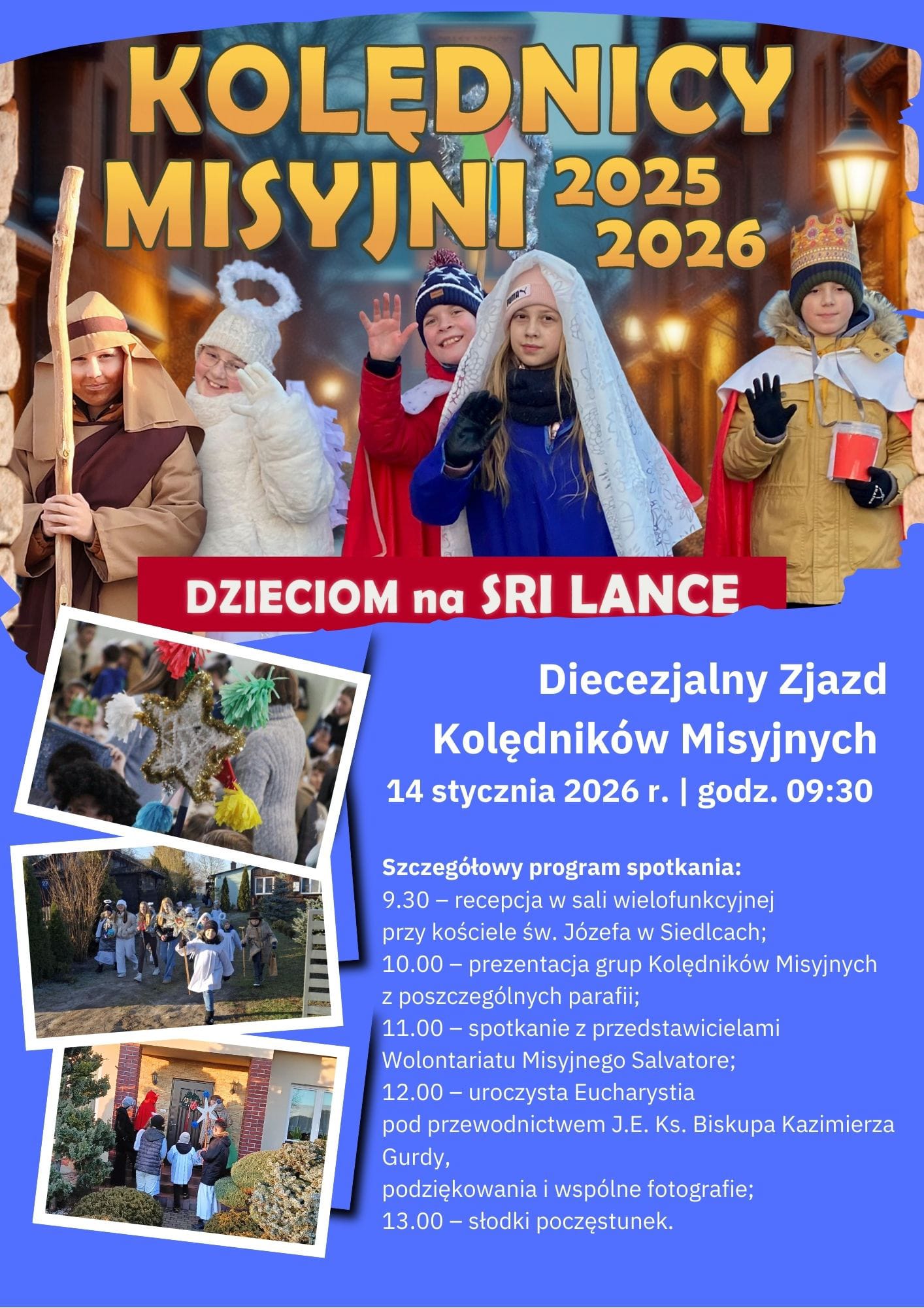 Jak co roku, w okresie Bożego Narodzenia w wielu parafiach diecezji siedleckiej rozbrzmiewa radosne kolędowanie. 26 grudnia rozpoczęła się bowiem akcja Kolędników Misyjnych, w której dzieci i młodzież – przebrani za postacie z bożonarodzeniowej szopki – wyruszają do domów, by dzielić się radością z narodzenia Jezusa i jednocześnie pomagać swoim rówieśnikom w najuboższych rejonach świata. Tegoroczna edycja odbywa się pod hasłem „Kolędnicy Misyjni – Dzieciom na Sri Lance”. Włączają się w nią najmłodsi diecezjanie a zwieńczeniem akcji w diecezji siedleckiej będzie Diecezjalny Zjazd Kolędników Misyjnych, który odbędzie się 14 stycznia 2026 roku w Siedlcach.