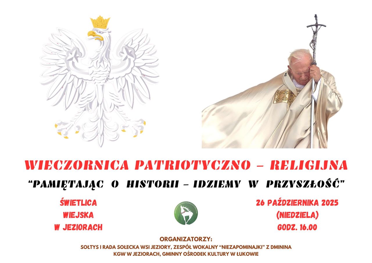 Wieczornica patriotyczno - religijna pod hasłem „Pamiętając o historii – idziemy w przyszłość” odbędzie się w najbliższą niedzielę, 26 października. Miejscem spotkania będzie miejscowa świetlica. Rozpocznie o godzinie 16:00. Wydarzenie to ma na celu uczczenie pamięci o Papieżu Polaki. W programie: występy artystyczne i wspólne śpiewanie pieśni.Organizatorami wydarzenia są sołtys i Rada Sołecka wsi Jeziory, Zespół Wokalny „Niezapominajki” z Dminina, Koło Gospodyń Wiejskich w Jeziorach oraz Gminny Ośrodek Kultury w Łukowie.