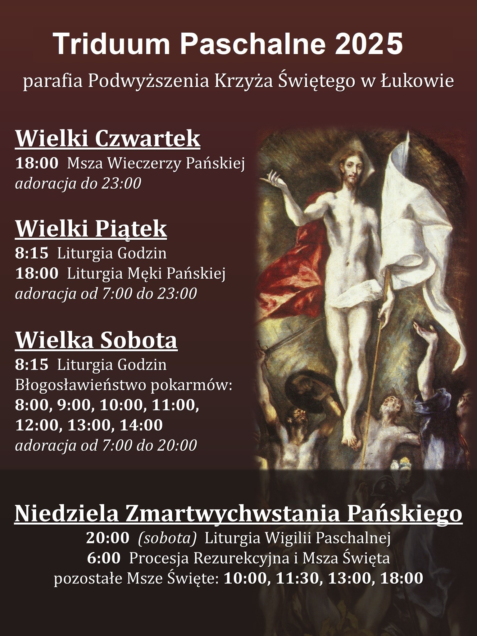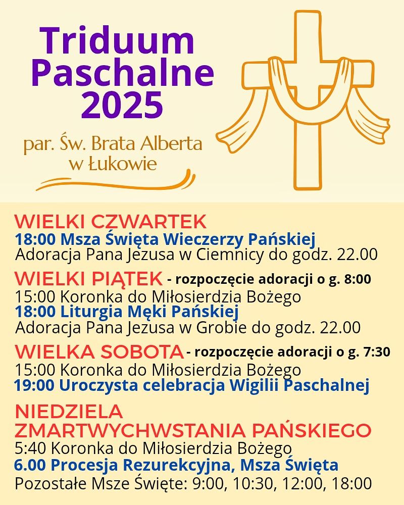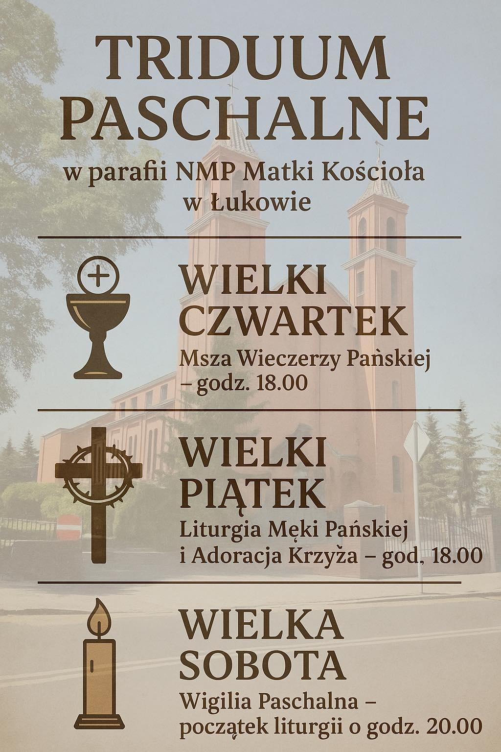 W czterech łukowskich parafiach Triduum Paschalne odbywać się będzie w następującym porządku:Parafia Przemienienia Pańskiego