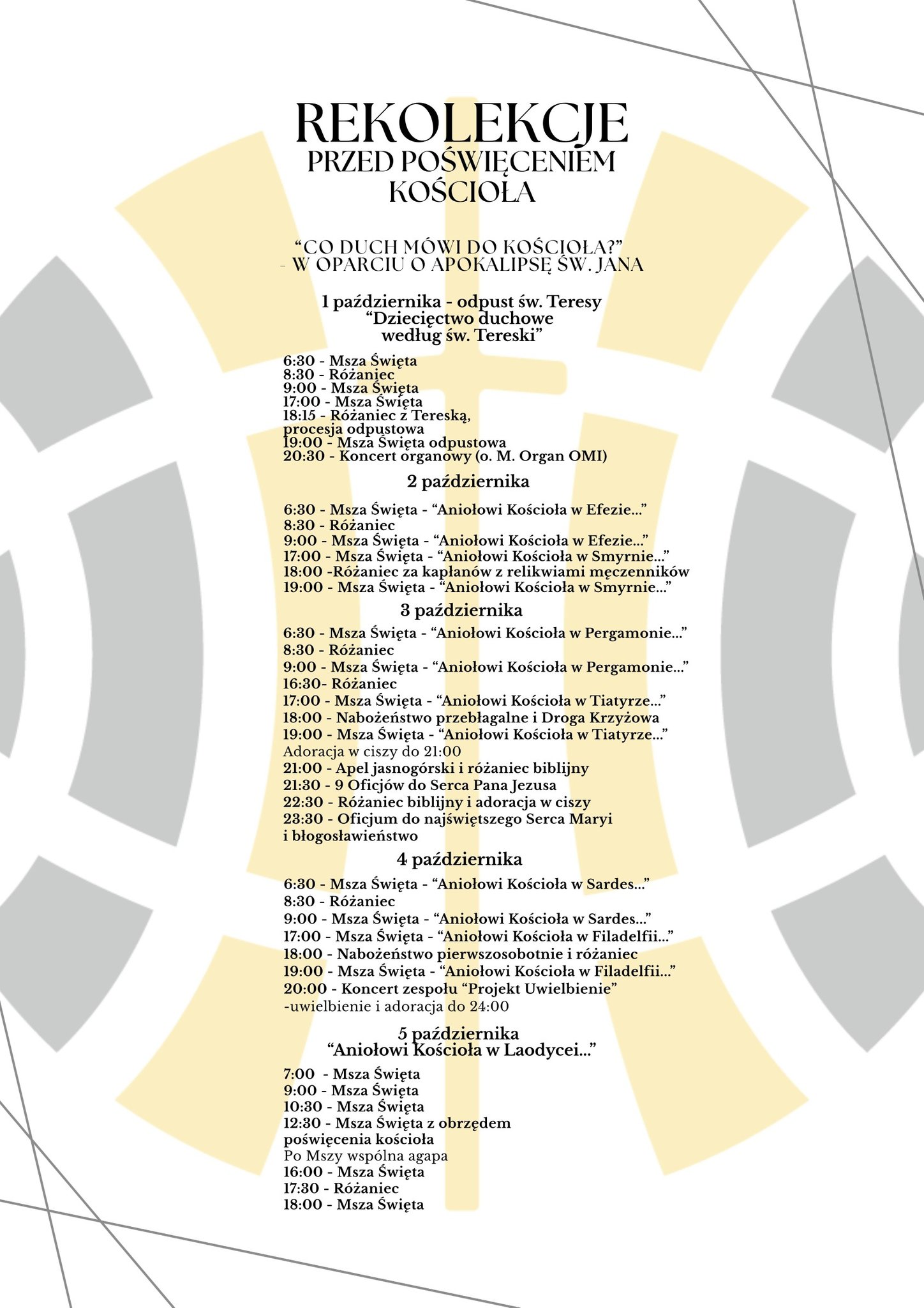 Rekolekcje rozpoczęły się 1 października, w dniu odpustu św. Teresy od Dzieciątka Jezus, patronki parafii. Zakończą się w niedzielę, 5 października, podczas uroczystej Mszy Świętej z obrzędem konsekracji kościoła o godz. 12:30.