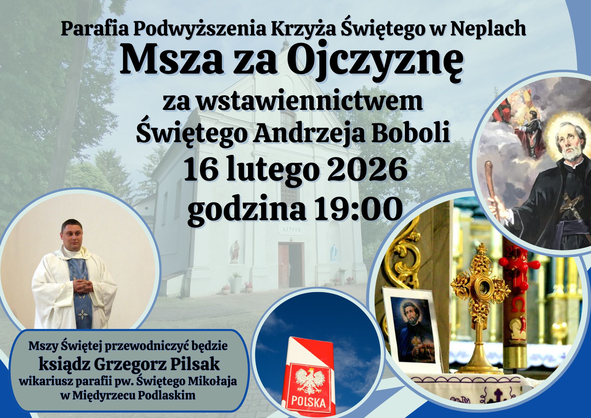 W kościele Podwyższenia Krzyża Świętego w Neplach, w najbliższy poniedziałek 16 lutego odprawiona zostanie Msza Święta za Ojczyznę przez wstawiennictwo św. Andrzeja Boboli. Modlitwie przewodniczyć będzie ksiądz Grzegorz Pilsak, wikariusz parafii Świętego Mikołaja w Międzyrzecu Podlaskim.