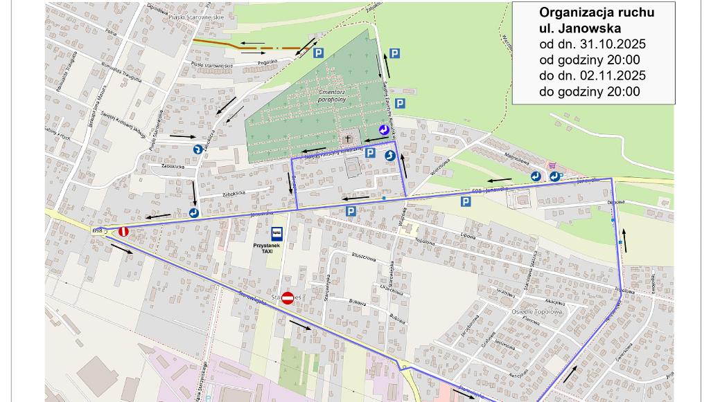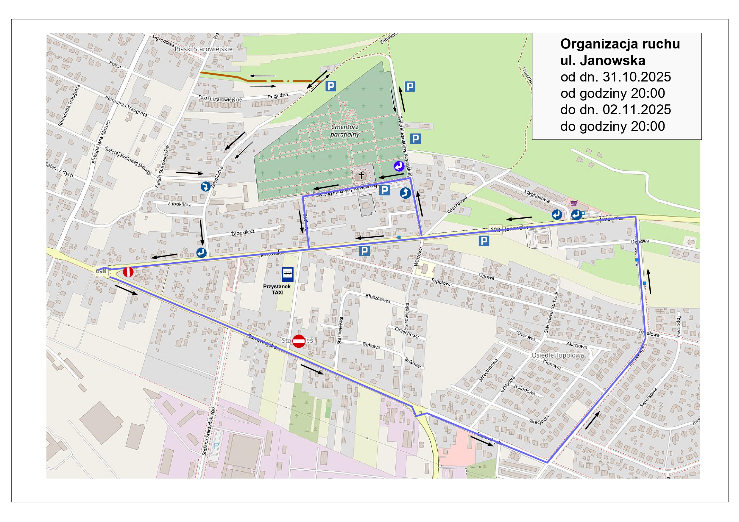Zmiana organizacji ruchu w rejonie cmentarza przy ul. Janowskiej obowiązuje już od dnia 31 października. Ulice św. Faustyny Kowalskiej oraz Zaciszna stały się ulicami jednokierunkowymi. Dojazd do cmentarza będzie możliwy ulicami: Starowiejską, Kasztanową, Janowską oraz św. Faustyny Kowalskiej.