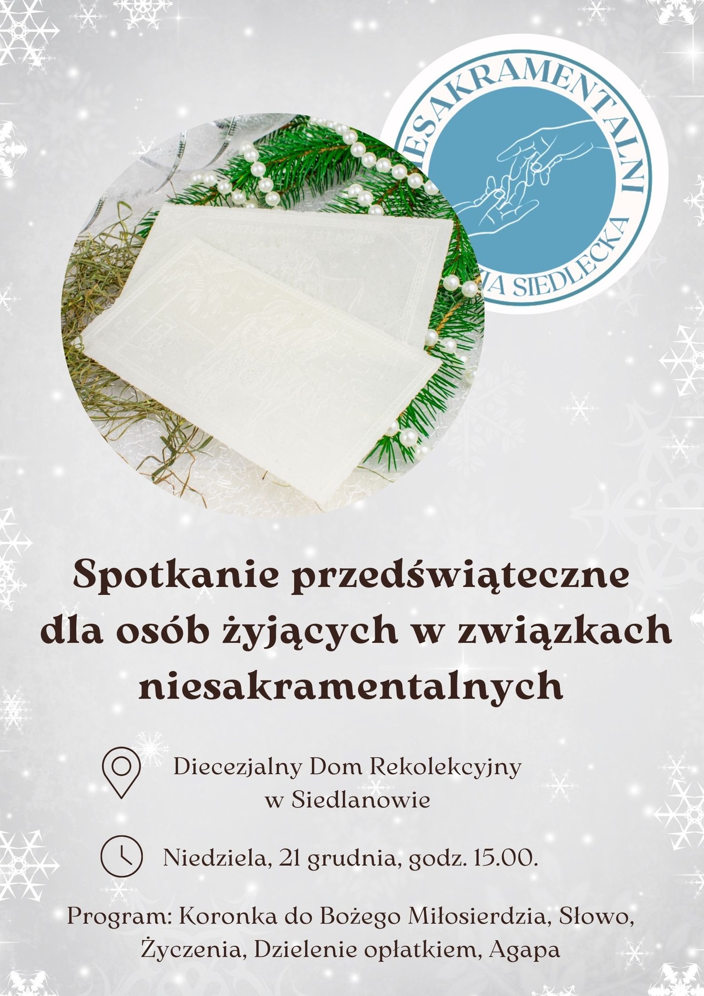 Tuż przed Świętami Bożego Narodzenia, w niedzielę 21 grudnia – która w tym roku przypada jako trzecia niedziela grudnia i czwarta niedziela Adwentu – Duszpasterstwo Rodzin Diecezji Siedleckiej zaprasza osoby żyjące w związkach niesakramentalnych na comiesięczne spotkanie w Diecezjalnym Domu Rekolekcyjnym w Siedlanowie.