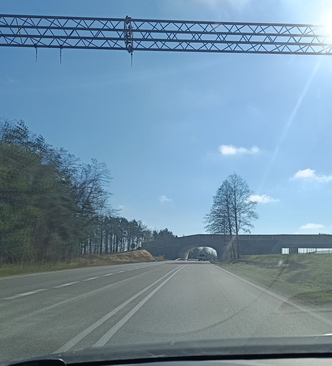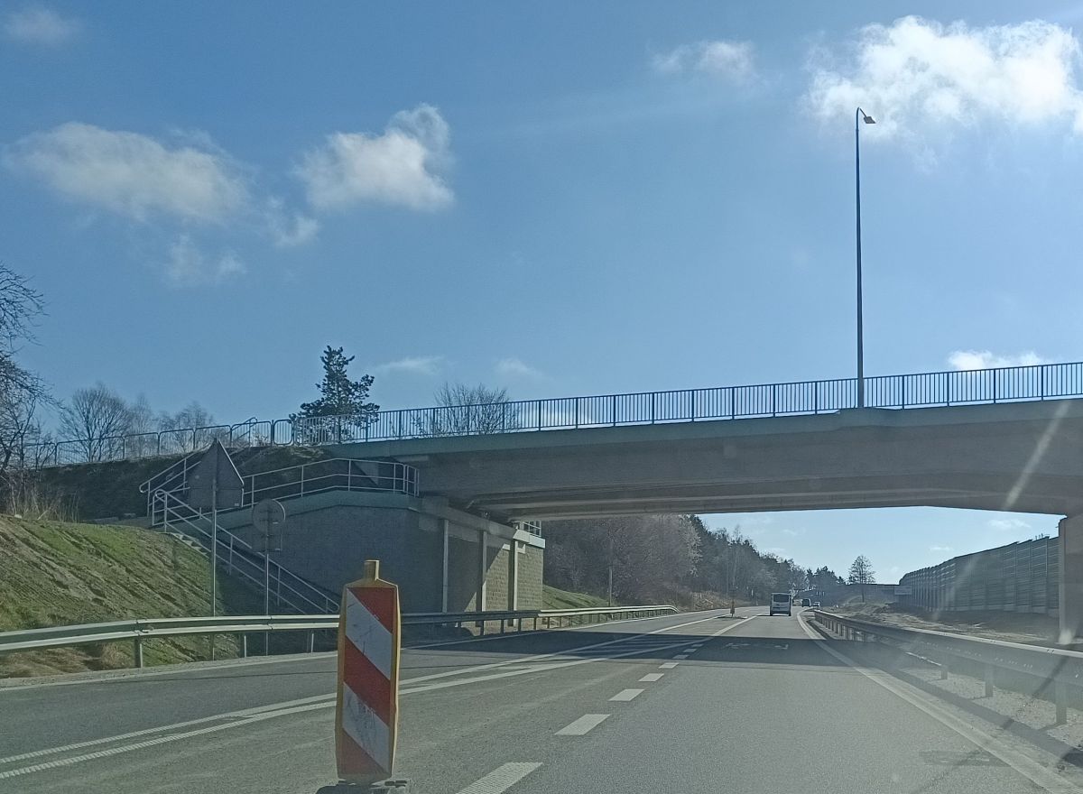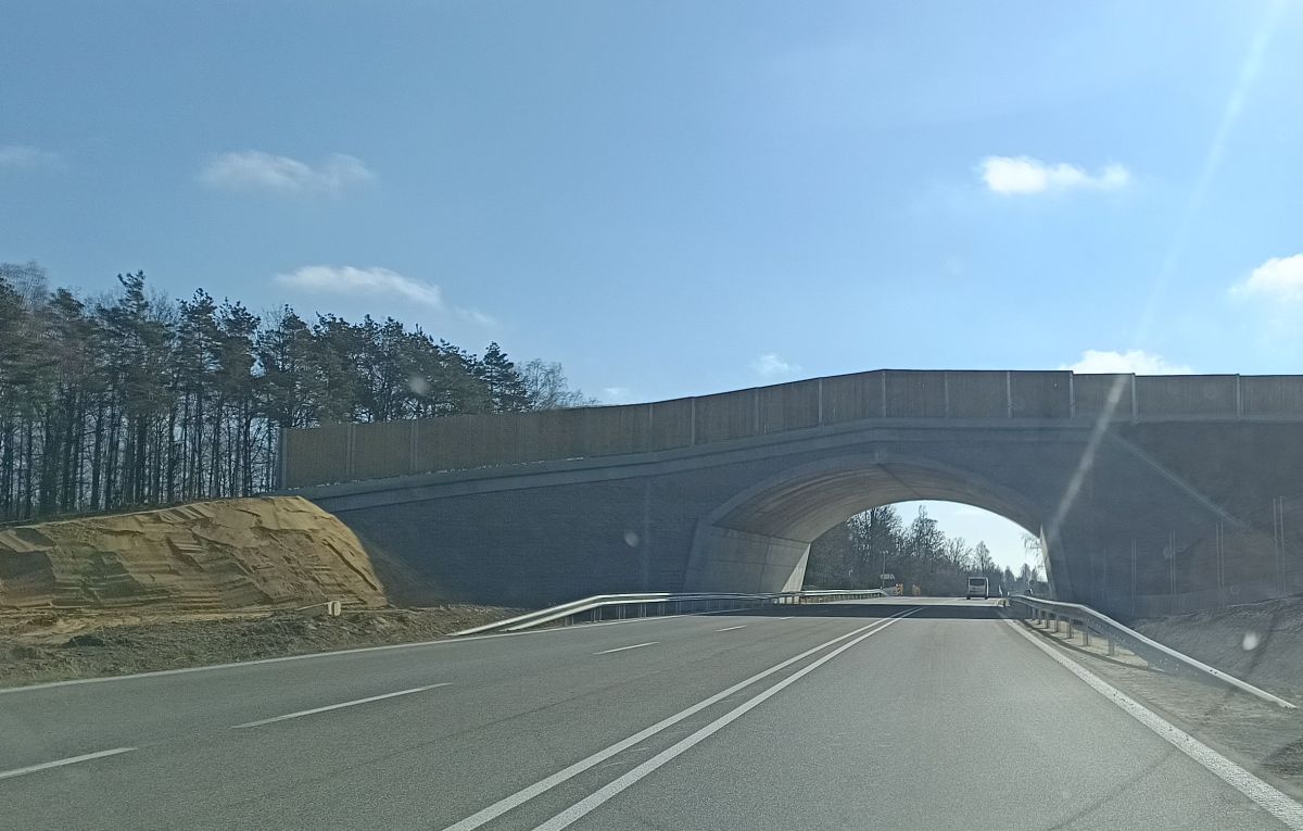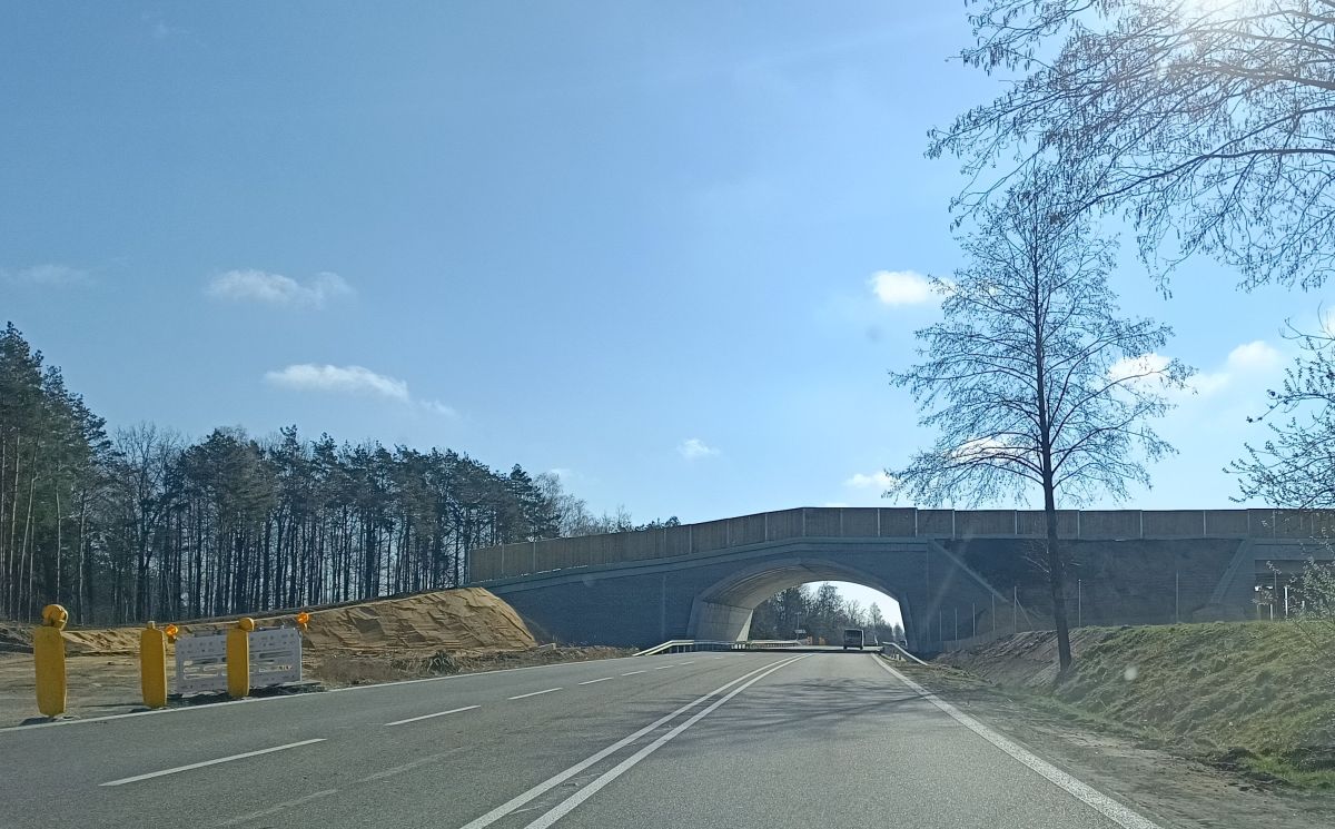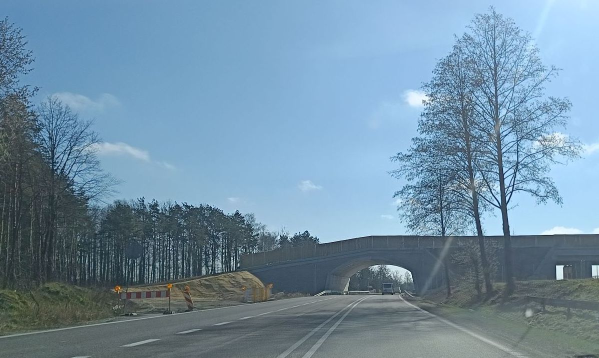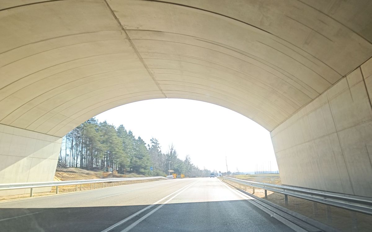 Zasadnicza konstrukcja powstała już dawno, ale roboty związane z jej wykończeniem ciągle blokowały przejazd. Trzeba było zwalniać i objeżdżać to miejsce prowizorycznie położonym w lesie, coraz bardziej popękanym i zapadającym się asfaltem. Teraz można już jechać prosto pod charakterystycznym łukiem. Jeszcze nie z pełną prędkością, uważając na ustawione na poboczu słupki, bo roboty jeszcze trwają. Likwidacja objazdu, formowanie prowadzącego na przejście nasypu i nasadzenia zajmą jeszcze kilka tygodni. Do tego czasu obowiązuje tam ograniczenie prędkości.
