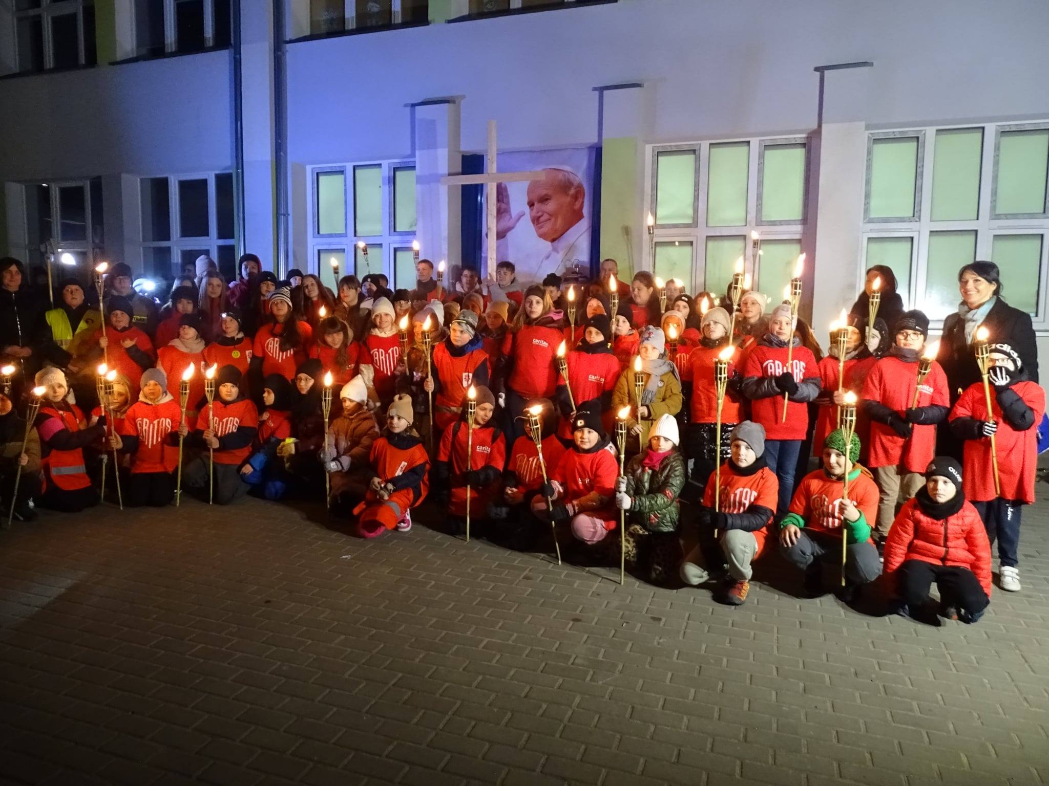 Relikwie patrona szkoły towarzyszyły uczestnikom w drodze, a oprawę muzyczną zapewnili lokalni muzycy i chór pod opieką nauczycieli.
