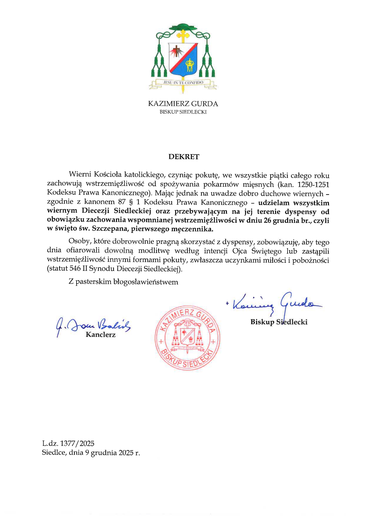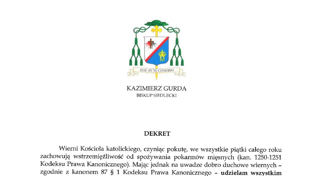 Biskup Siedlecki Kazimierz Gurda udzielił dyspensy od obowiązku zachowania wstrzemięźliwości od pokarmów mięsnych w święto św. Szczepana, pierwszego męczennika, które przypada w tym roku w piątek. Dyspensa obejmuje wszystkich wiernych Diecezji Siedleckiej oraz osoby przebywające na jej terenie.