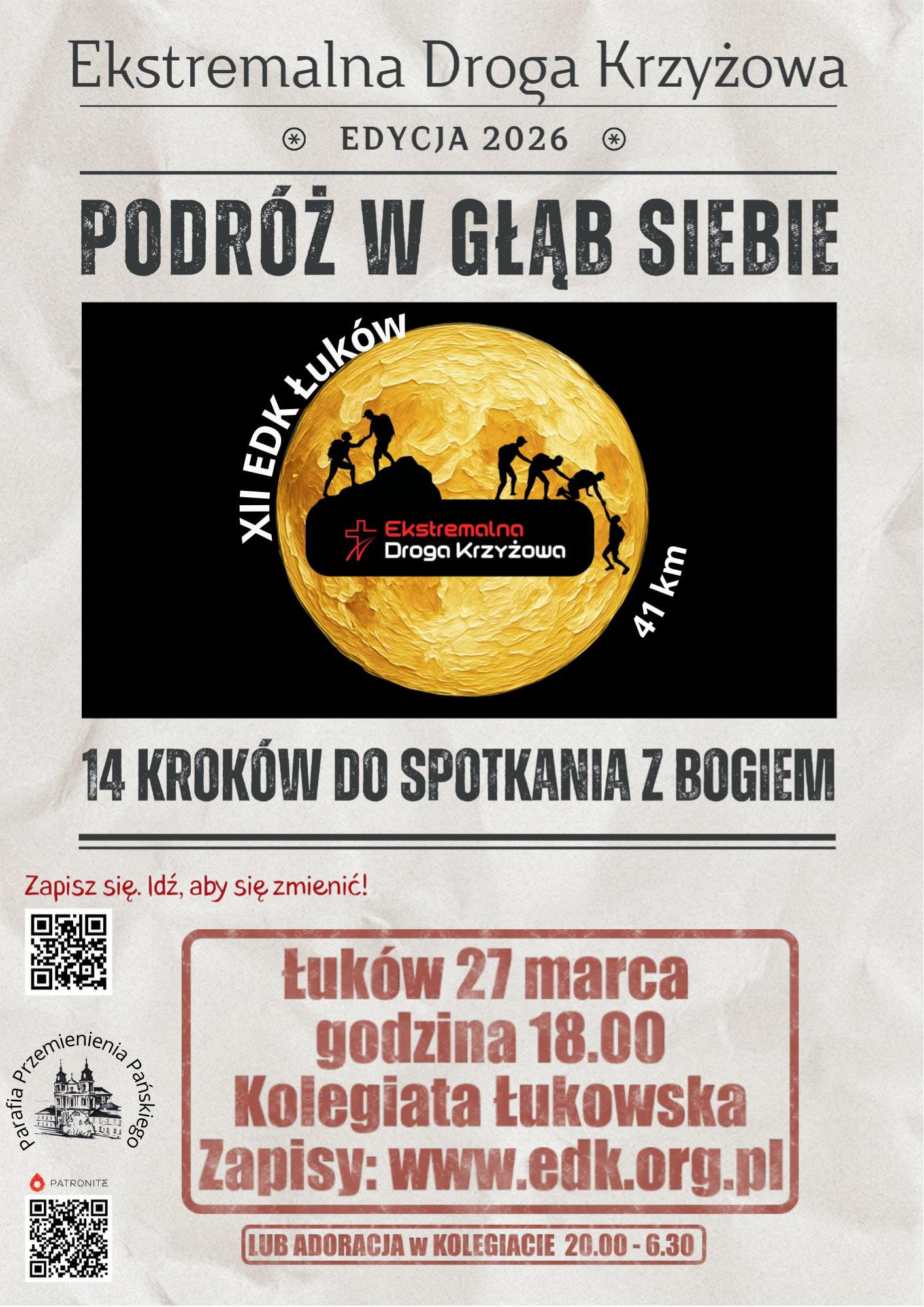 Już w najbliższy piątek, 27 marca w Łukowie odbędzie się kolejna edycja Ekstremalnej Drogi Krzyżowej organizowanej przez parafię Przemienienia Pańskiego. Wydarzenie, które co roku przyciąga osoby szukające duchowego wyzwania i chwili refleksji, tym razem przebiega pod hasłem „Podróż w głąb siebie”.