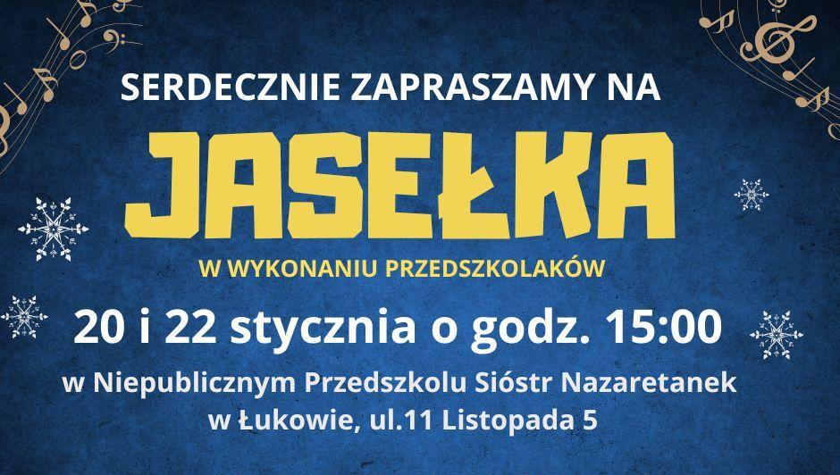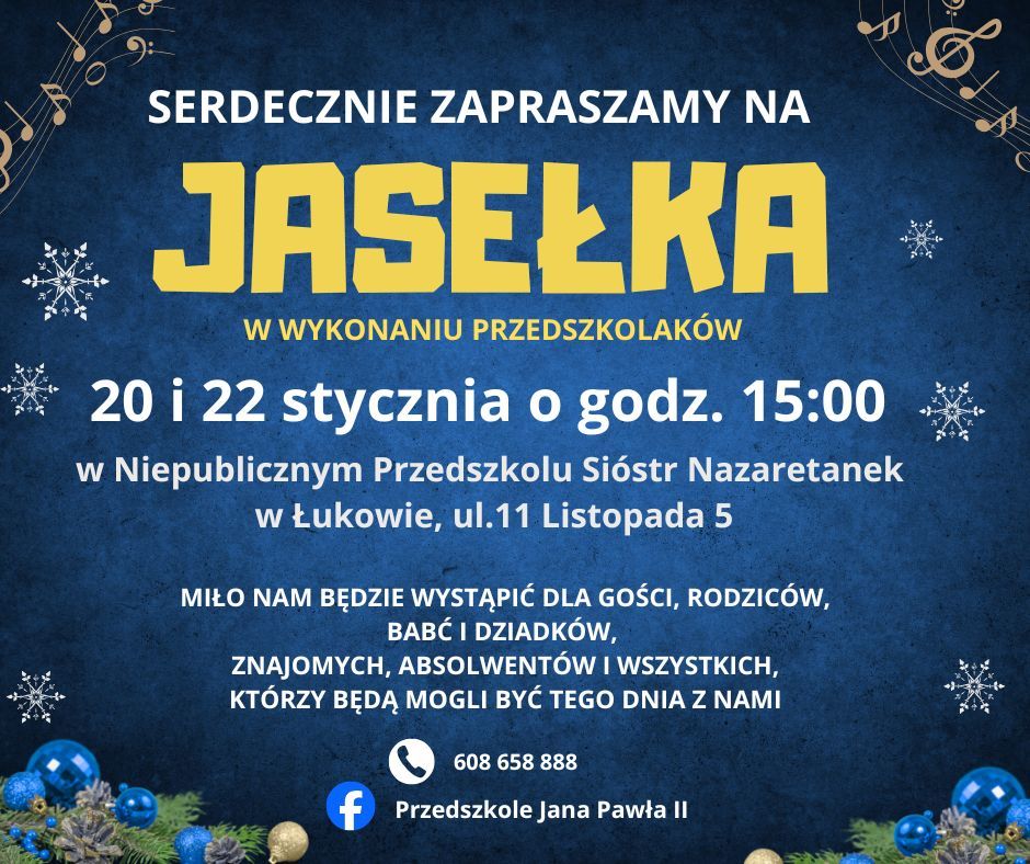 W Niepublicznym Przedszkolu Sióstr Nazaretanek w Łukowie odbędą się jasełka w wykonaniu przedszkolaków. Mali artyści zaprezentują świąteczne przedstawienie pełne kolęd, pastorałek oraz scen nawiązujących do bożonarodzeniowej tradycji.