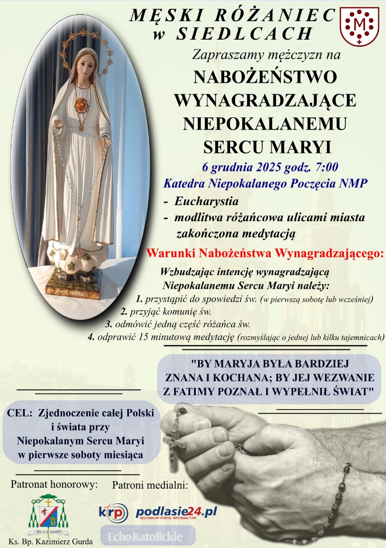 Mężczyźni z inicjatywy Męski Różaniec w Siedlcach zapraszają na Nabożeństwo Wynagradzające Niepokalanemu Sercu Maryi. Sobotnie (6 grudnia) spotkanie modlitewne rozpocznie się Eucharystią w siedleckiej katedrze o godz. 7:00.
