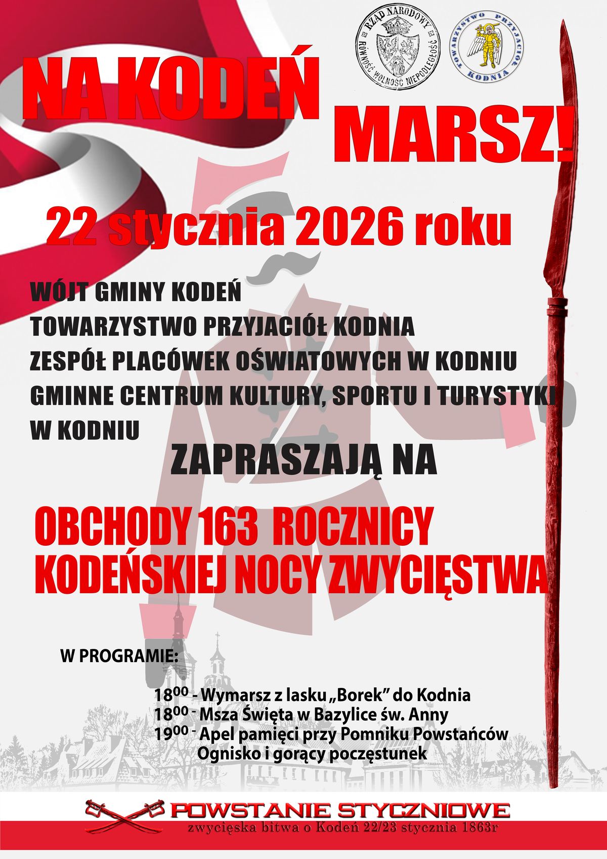 W organizację uroczystości włączyli się: Wójt Gminy Kodeń, Gminne Centrum Kultury, Sportu i Turystyki w Kodniu, Zespół Placówek Oświatowych w Kodniu oraz Towarzystwo Przyjaciół Kodnia. Obchody mają na celu nie tylko oddanie hołdu bohaterom sprzed 163 lat, ale także przypomnienie lokalnej historii i budowanie patriotycznej świadomości kolejnych pokoleń.Centralnym punktem wydarzenia będzie ponad czterokilometrowy marsz historyczny, który rozpocznie się około godziny 18.00 w lasku „Borek” – miejscu koncentracji powstańców przed atakiem na stacjonujący w Kodniu rosyjski garnizon. Uczestnicy marszu, podążając śladami bohaterów z 1863 roku, zatrzymają się na cmentarzu, gdzie złożą kwiaty na mogile powstańczej, a następnie zakończą przemarsz przy pomniku w centrum Kodnia.