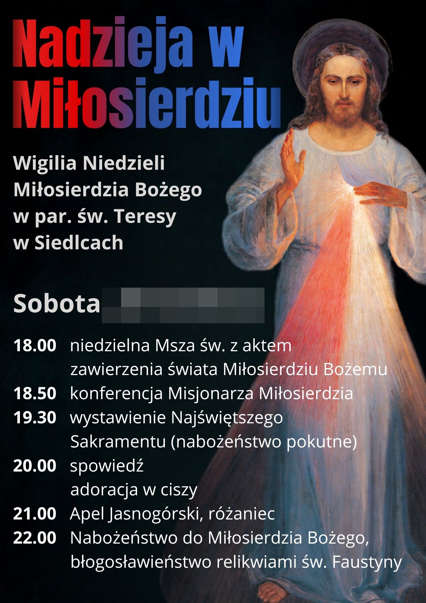 W programie:18.00 – Msza św. z aktem zawierzenia świata Miłosierdziu Bożemu
