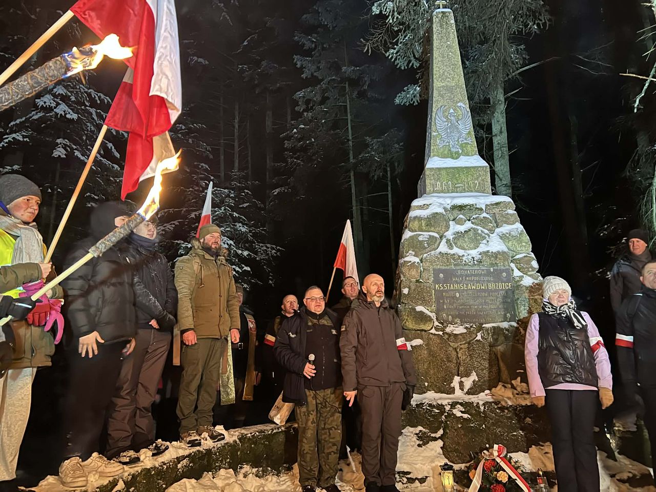 Tuż przed północą wszyscy spotkali się w Rezerwacie Jata. Wspólnie pokonali ostatni odcinek prowadzący do pomnika księdza Stanisława Brzóski. Tam odśpiewano hymn, odczytano Apel Pamięci i złożono kwiaty. Apel poległych odczytał jeden z kleryków z seminarium duchownego w Siedlcach. Grupa kleryków co roku jest na rajdzie, a razem z nimi ksiądz Jerzy Majek.