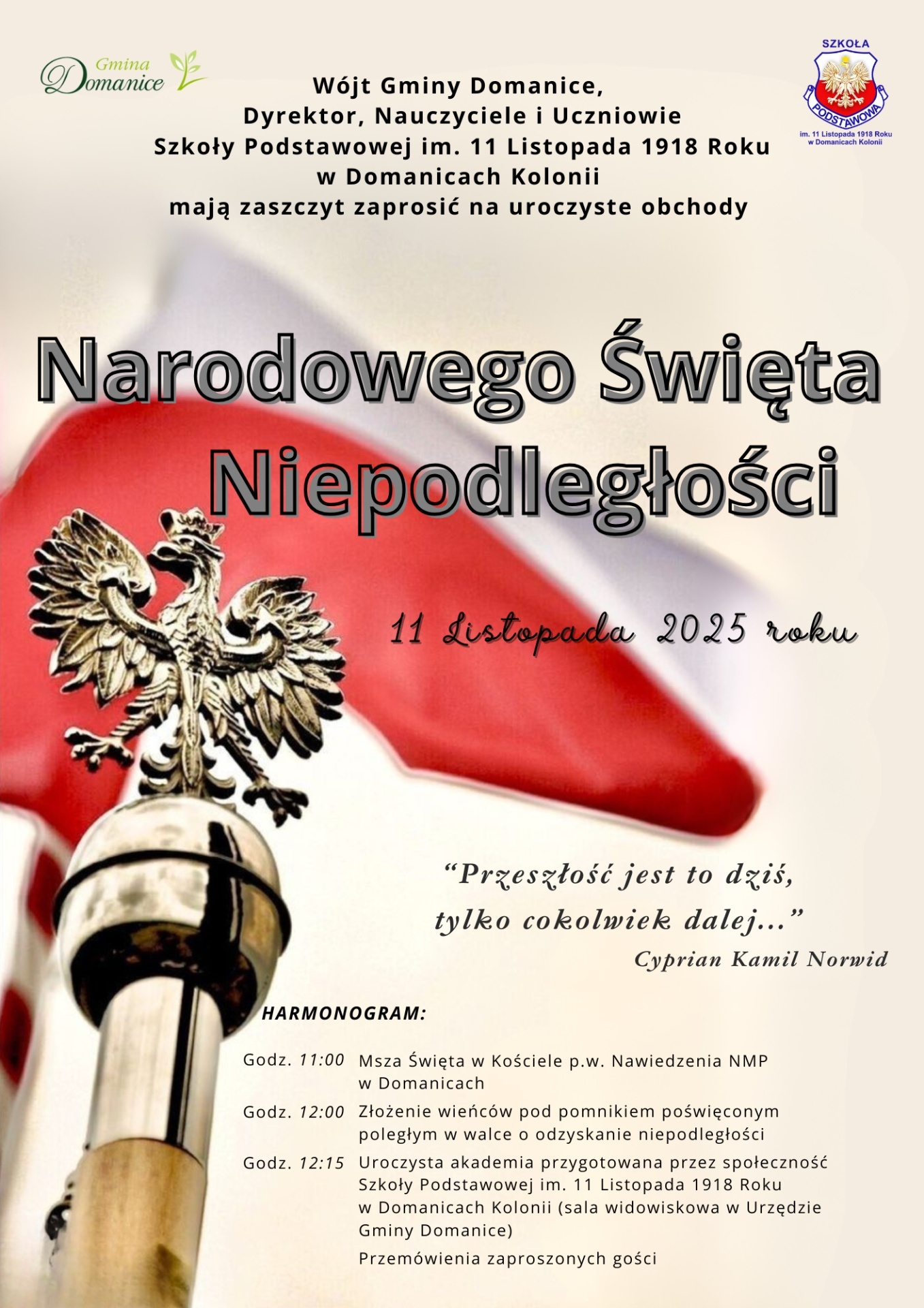 Proboszcz parafii w Domanicach, Wójt Gminy Domanice oraz Dyrektor, Nauczyciele i Uczniowie Szkoły Podstawowej im. 11 Listopada 1918 roku w Domanicach-Kolonii zapraszają wszystkich mieszkańców do wspólnego świętowania Narodowego Święta Niepodległości, które odbędzie się we wtorek, 11 listopada. Wydarzenie ma charakter otwarty i będzie wyjątkową okazją, by wspólnie uczcić 107. rocznicę odzyskania przez Polskę niepodległości.