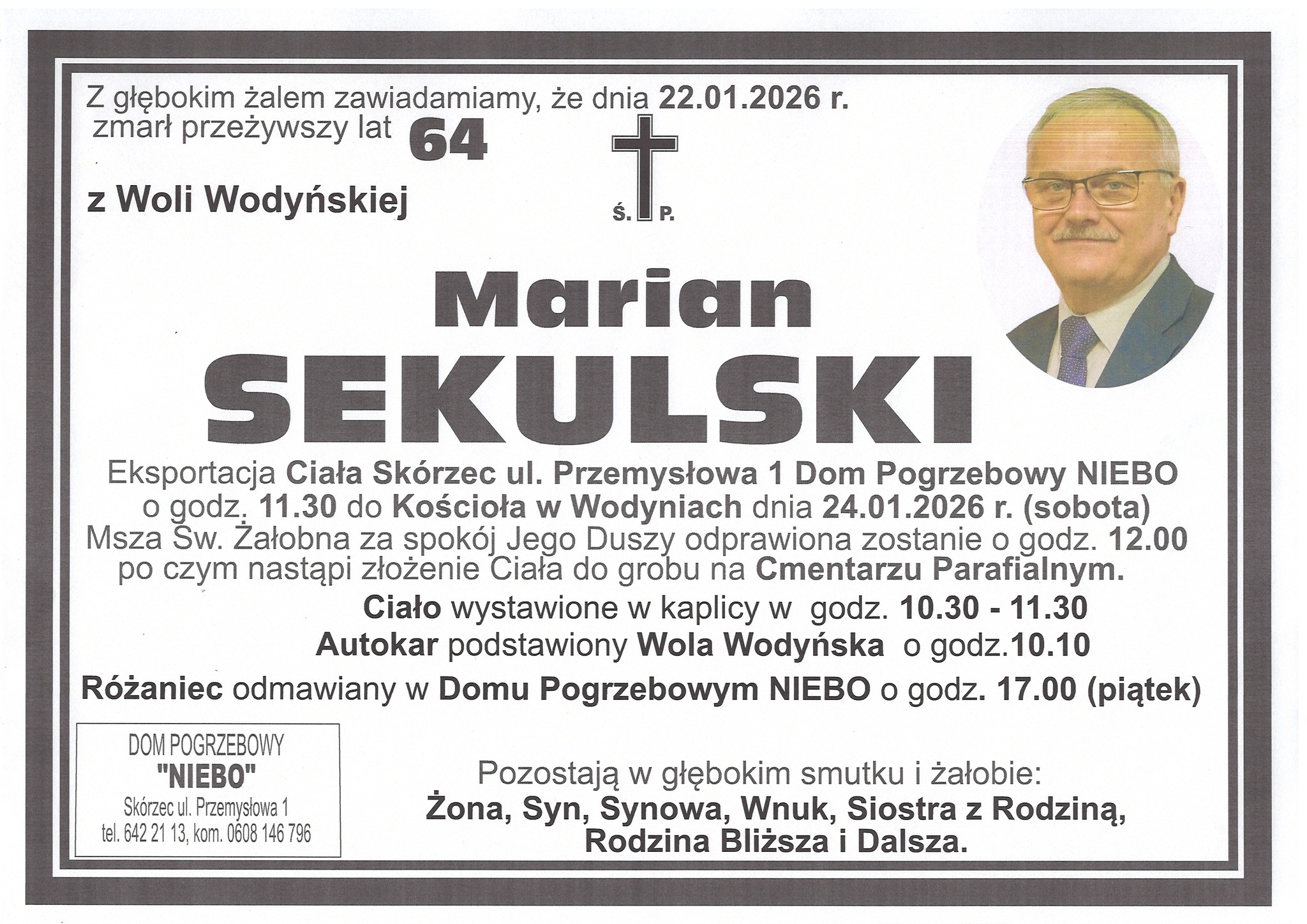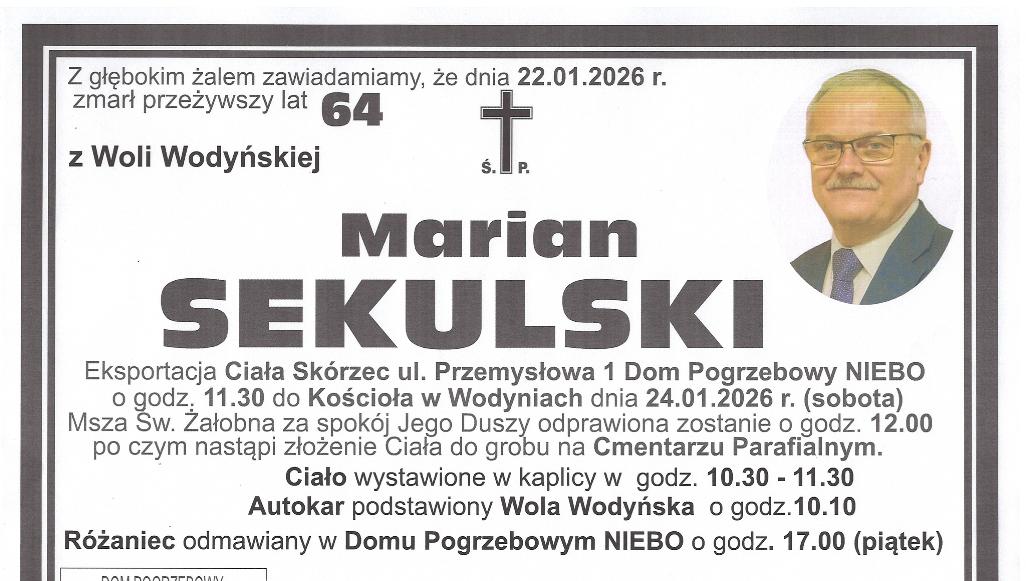 Marian Sekulski pełnił funkcję wójta Gminy Wodynie w latach 2004–2014. W czasie jego kadencji rozpoczęła się wieloletnia współpraca samorządu z Radiem Podlasie. Był patriotą, podkreślającym wagę lokalnych inicjatyw i promowania tego, co najlepsze w lokalnych społecznościach.Eksportacja ciała śp. Mariana Sekulskiego z Domu Pogrzebowego „Niebo” w Skórcu rozpocznie się o godz. 11:30. O godz. 12:00 w kościele parafialnym w Wodyniach zostanie odprawiona Msza święta pogrzebowa. Po niej ciało zmarłego zostanie złożone na miejscowym cmentarzu parafialnym.