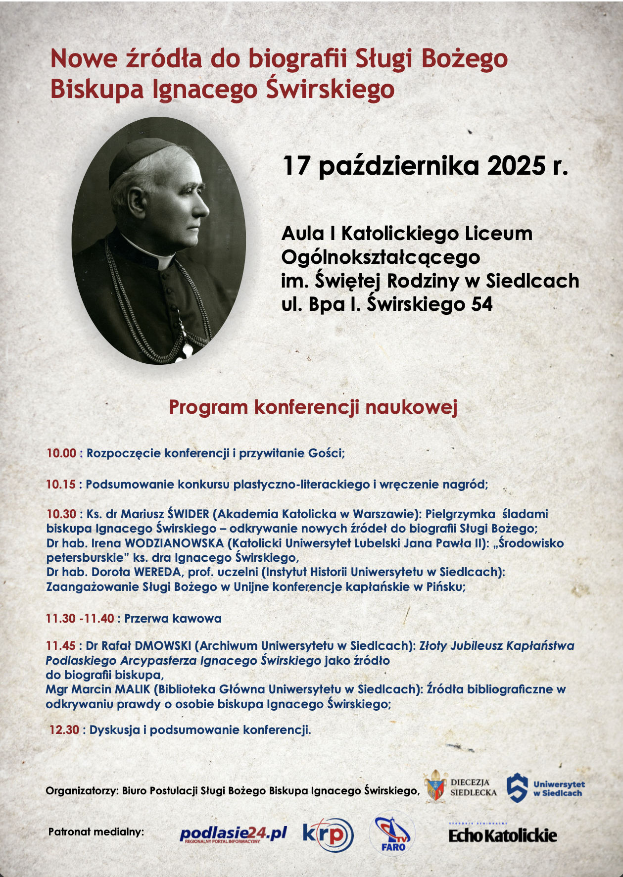 Konferencja naukowa poświęcona nowym źródłom do biografii Sługi Bożego biskupa Ignacego Świrskiego odbędzie się w piątek, 17 października w Katolickim Liceum Ogólnokształcącym im. Świętej Rodziny w Siedlcach. Spotkanie rozpocznie się o godzinie 10:00, a w programie m.in. wystąpienia naukowców z Warszawy, Lublina i Siedlec, którzy przybliżą mniej znane wątki z życia biskupa – jego działalność duszpasterską, środowisko, w którym się kształtował, a także niepublikowane dotąd materiały źródłowe.