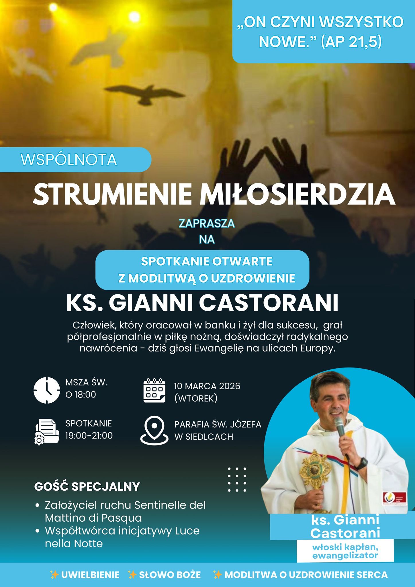 W przyszłym tygodniu Siedlce staną się miejscem wyjątkowego wydarzenia duchowego. Wspólnota „Strumienie Miłosierdzia” zaprasza na spotkanie otwarte z ks. Giannim Castoranim – włoskim kapłanem, którego życie jest radykalnym świadectwem nawrócenia, a jego dzieła ewangelizacyjne od lat poruszają Włochy i Europę.
