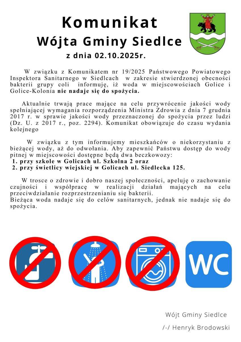 W Golicach i Golicach-Kolonii Sanepid wykrył niebezpieczną zawartość bakterii z grupy coli. Woda nie nadaje się do spożycia, nie jest też zalecane używanie jej do mycia i prania. W grę wchodzi praktycznie tylko spłukiwanie toalet. Gmina informuje, że wodę pitną mieszkańcy mogą czerpać z beczkowozów podstawionych koło szkoły i koło świetlicy w Golicach.