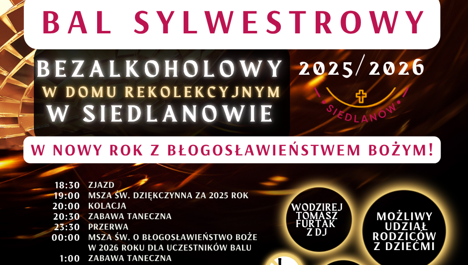Pod hasłem „W Nowy Rok z Błogosławieństwem Bożym” w Domu Rekolekcyjnym w Siedlanowie zaplanowano wspólne powitanie Nowego Roku 2026. Inicjatywa łączy elementy duchowe z integracyjną zabawą sylwestrową.