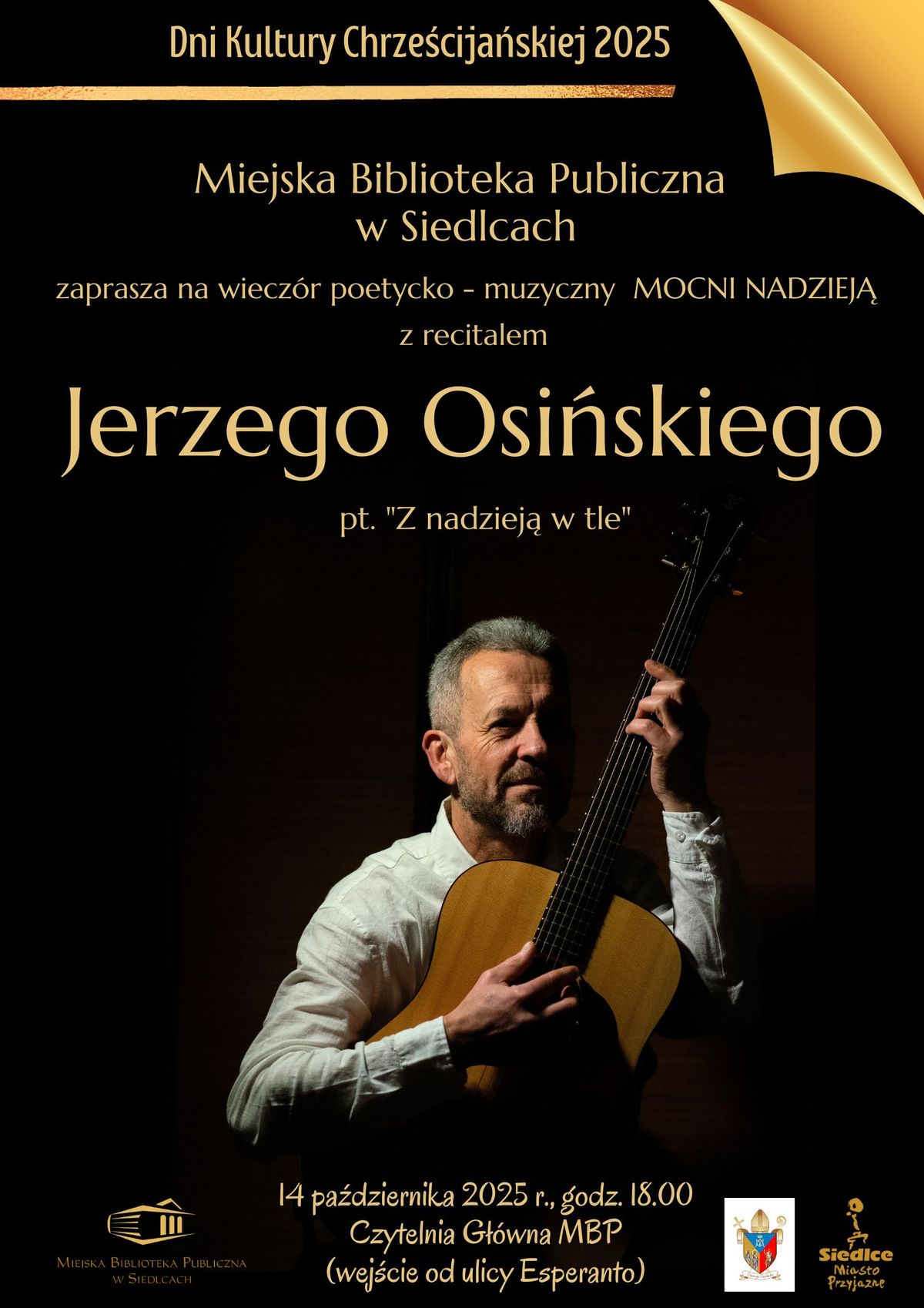 Miejska Biblioteka Publiczna w Siedlcach organizuje wieczór poetycko-muzyczny „Mocni nadzieją”, który odbędzie się we wtorek, 14 października o godzinie 18:00 w Czytelni Głównej. W programie recital Jerzego Osińskiego zatytułowany „Z nadzieją w tle”. Koncert odbędzie się w ramach Dni Kultury Chrześcijańskiej.
