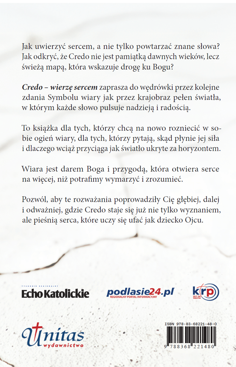 Książka pomaga uporządkować podstawowe treści chrześcijaństwa i odkryć ich aktualność w świecie pełnym pytań, niepewności i zmieniających się perspektyw. Pokazuje, że Credo nie jest tekstem zamkniętym w przeszłości, lecz żywym wyznaniem, które może stać się punktem odniesienia także dla współczesnego człowieka – niezależnie od jego doświadczeń czy etapu drogi wiary.