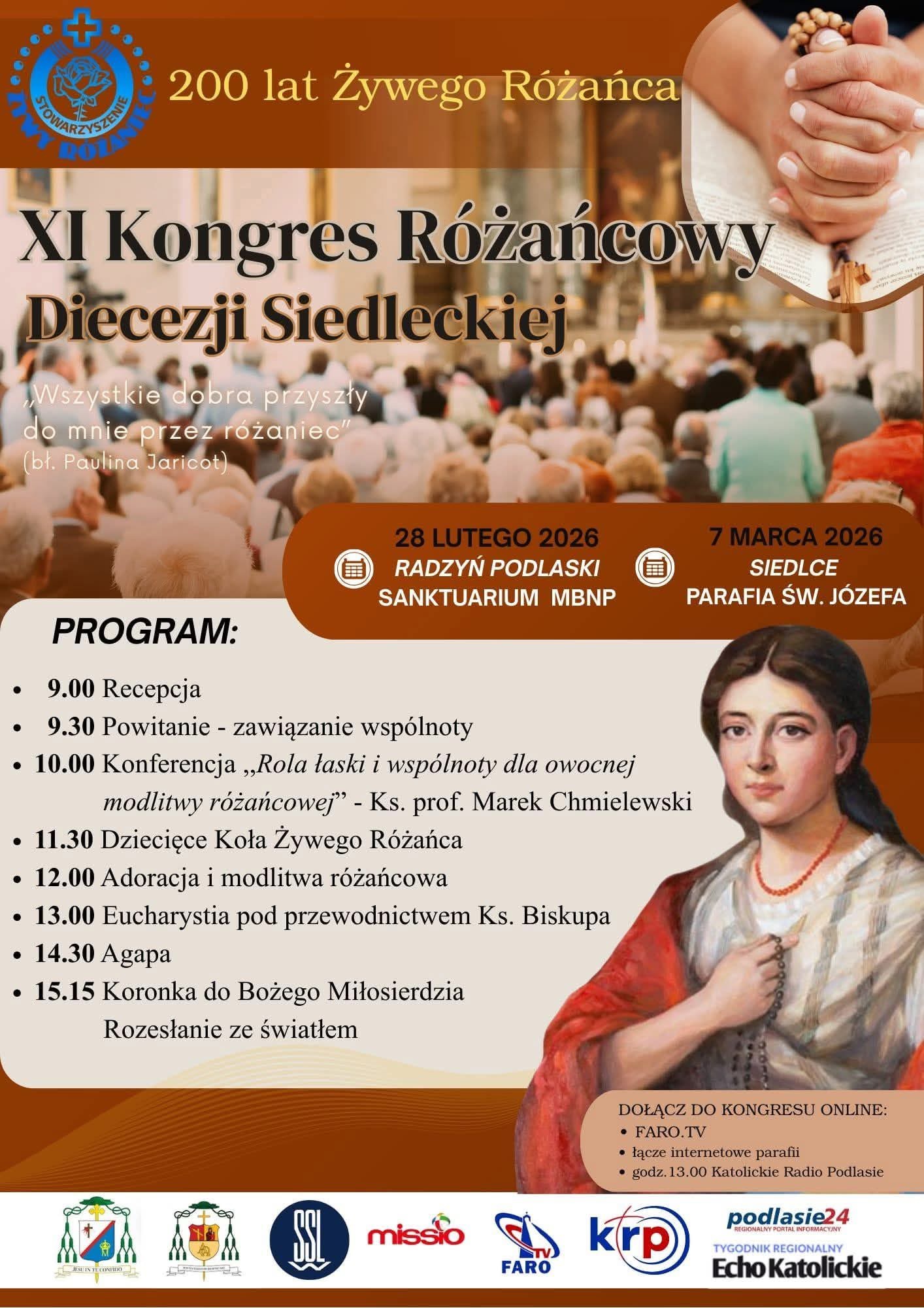 „Wszystkie dobra przyszły do mnie przez różaniec” – słowa bł. Pauliny Jaricot towarzyszą obchodom jubileuszu 200-lecia Żywego Różańca. W Diecezji Siedleckiej głównym wydarzeniem roku jubileuszowego będzie XI Kongres Żywego Różańca. W sobotę spotkanie odbędzie się w Siedlce. Początek o godzinie 9.30. Msza święta o godz. 13.00 będzie transmitowana przez Katolickie Radio Podlasie, natomiast całość wydarzenia pokaże Diecezjalna Telewizja Internetowa Faro TV.
