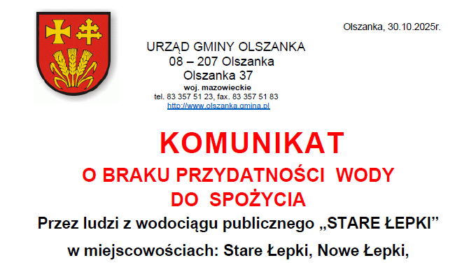 Region Łosice Olszanka Czw. 30.10.2025 14:25:52 Woda ze Stacji Uzdatniania Wody w Starych Łepkach nie nadaje się do spożycia