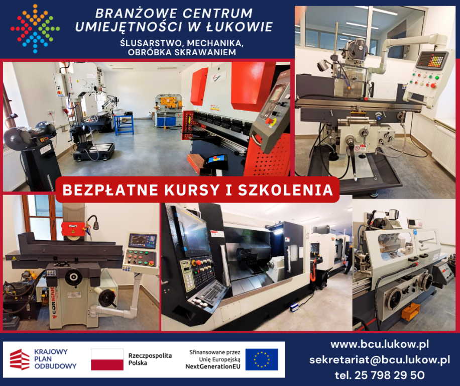 Działające w ramach przedsięwzięcia: Utworzenie i wsparcie funkcjonowania Branżowego Centrum Umiejętności w Łukowie w dziedzinie ślusarstwo, mechanika, obróbka skrawaniem, dofinansowywanego ze środków Krajowego Planu Odbudowy, w ramach ogłoszonego przez Fundację Rozwoju Systemu Edukacji (FRSE) konkursu: Utworzenie i wsparcie funkcjonowania 120 branżowych centrów umiejętności (BCU), realizujących koncepcję centrów doskonałości zawodowej (CoVEs), w ramach Krajowego Planu Odbudowy i Zwiększania Odporności, w Komponencie A "Odporność i konkurencyjność gospodarki", jako inwestycja A3.1.1 "Wsparcie rozwoju nowoczesnego kształcenia zawodowego, szkolnictwa wyższego oraz uczenia się przez całe życie"