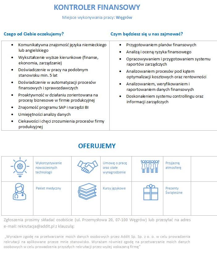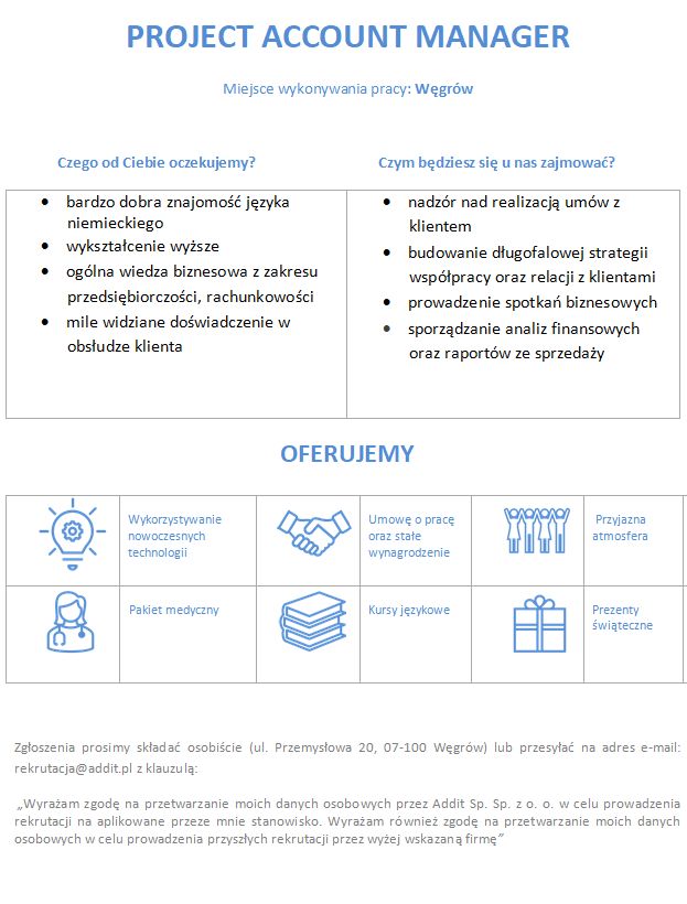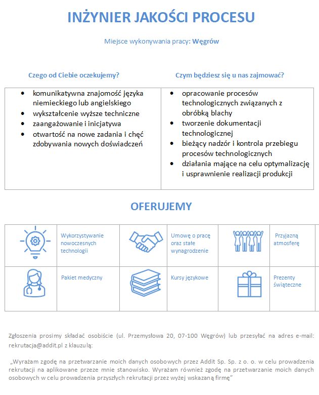 Firma Addit jest jednym z największych producentów elementów i maszyn z blach w Europie. Na rynku istnieje od ponad 25 lat. Zespół składa się z 800 osób. Dzięki innowacyjnemu podejściu nieustannie się rozwija. - Pracując u nas będziesz miał okazję wprowadzać nowe technologie oraz produkty, które dziś nie są jeszcze dostępne na rynku – zapewnia firma.