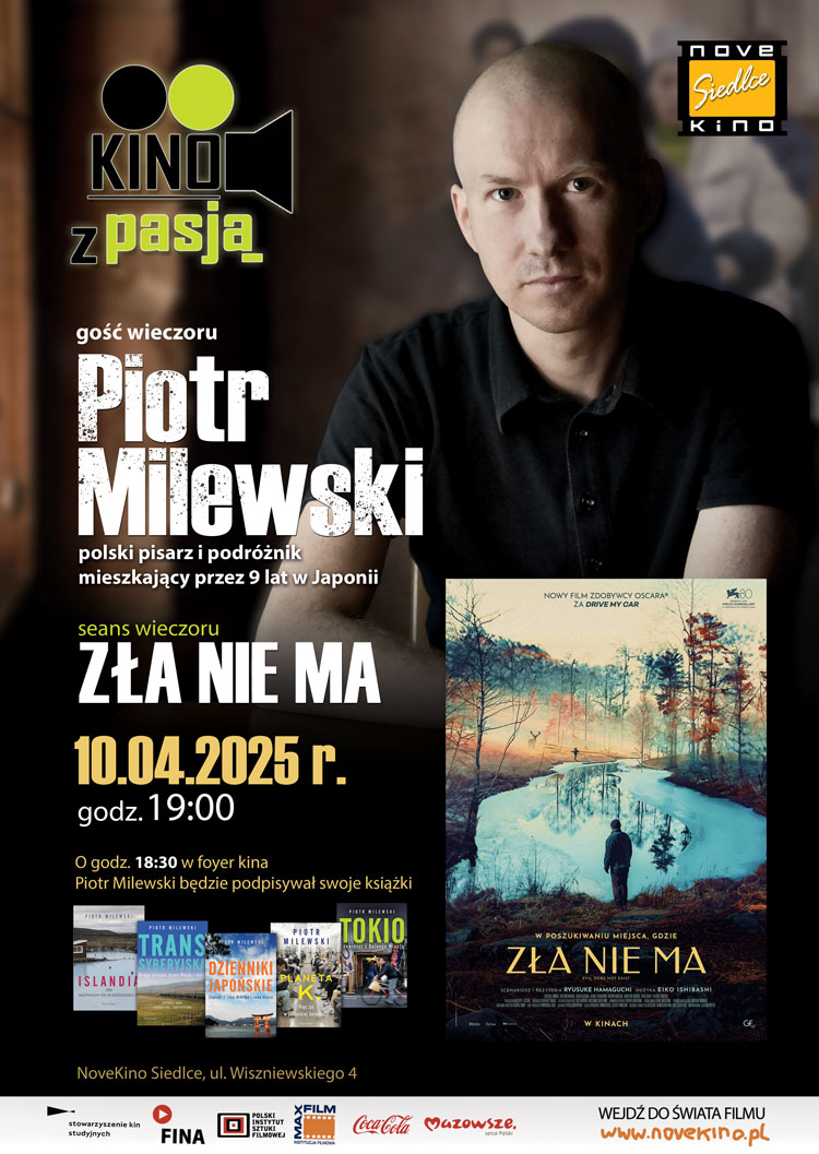 Piotr Milewski, podróżnik i pisarz, który spędził blisko dekadę życia w Japonii, autor bestselerowych książek „Transsyberyjska”, „Dzienniki Japońskie”, „Planeta K”, „Islandia” i „Tokio” będzie gościem najbliższego, czwartkowego spotkania spotkania w ramach cyklu „Kino z pasją” w NoveKino Siedlce. Wieczór połączony będzie ze specjalnym seansem obsypanego nagrodami na festiwalu w Wenecji filmu „Zła nie ma” japońskiego reżysera Ryûsuke Hamaguchiego. Dla czytelników portalu Podlasie.24 mamy dwa podwójne zaproszenia na czwartkowe spotkanie w ramach cyklu „Kino z pasją” w NoveKino Siedlce.