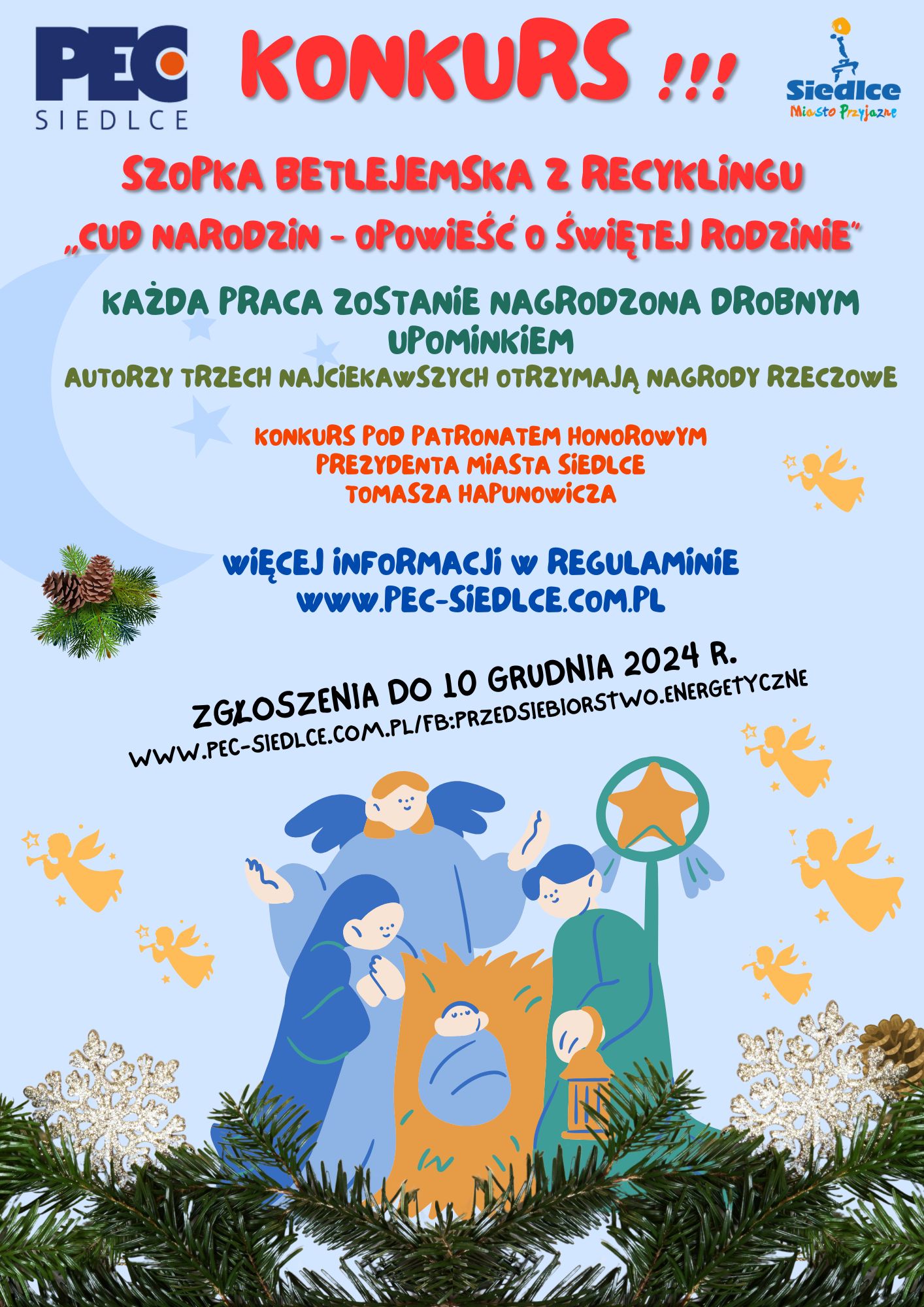 Konkurs organizuje Przedsiębiorstwo Energetyczne w Siedlcach Sp. z o.o. a Patronatem Honorowym objął tę akcję prezydent Siedlec Tomasz Hapunowicz.Boże Narodzenie to czas, który od pokoleń łączy ludzi wokół tradycji, takich jak wspólne kolędowanie, ubieranie choinki czy budowanie szopek betlejemskich. Szopka betlejemska jest tradycją, która symbolizuje scenę narodzin Jezusa Chrystusa i jest obecna w wielu domach i miejscach publicznych w okresie świąt Bożego Narodzenia. To także symbol miłości, pokoju i radości, który łączy ludzi.