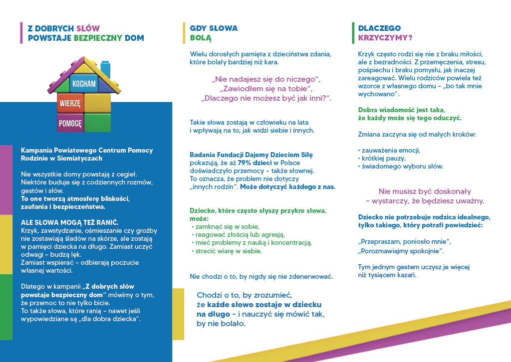 Powiatowe Centrum Pomocy Rodzinie w Siemiatyczach realizuje kampanię społeczną: „Z dobrych słów powstaje bezpieczny dom”, której celem jest zwrócenie uwagi na znaczenie słów w relacjach rodzinnych i przeciwdziałanie przemocy emocjonalnej wobec dzieci. Chcemy pokazać, że bezpieczeństwo dziecka buduje się nie tylko przez troskę fizyczną, ale również przez sposób, w jaki z nim rozmawiamy.