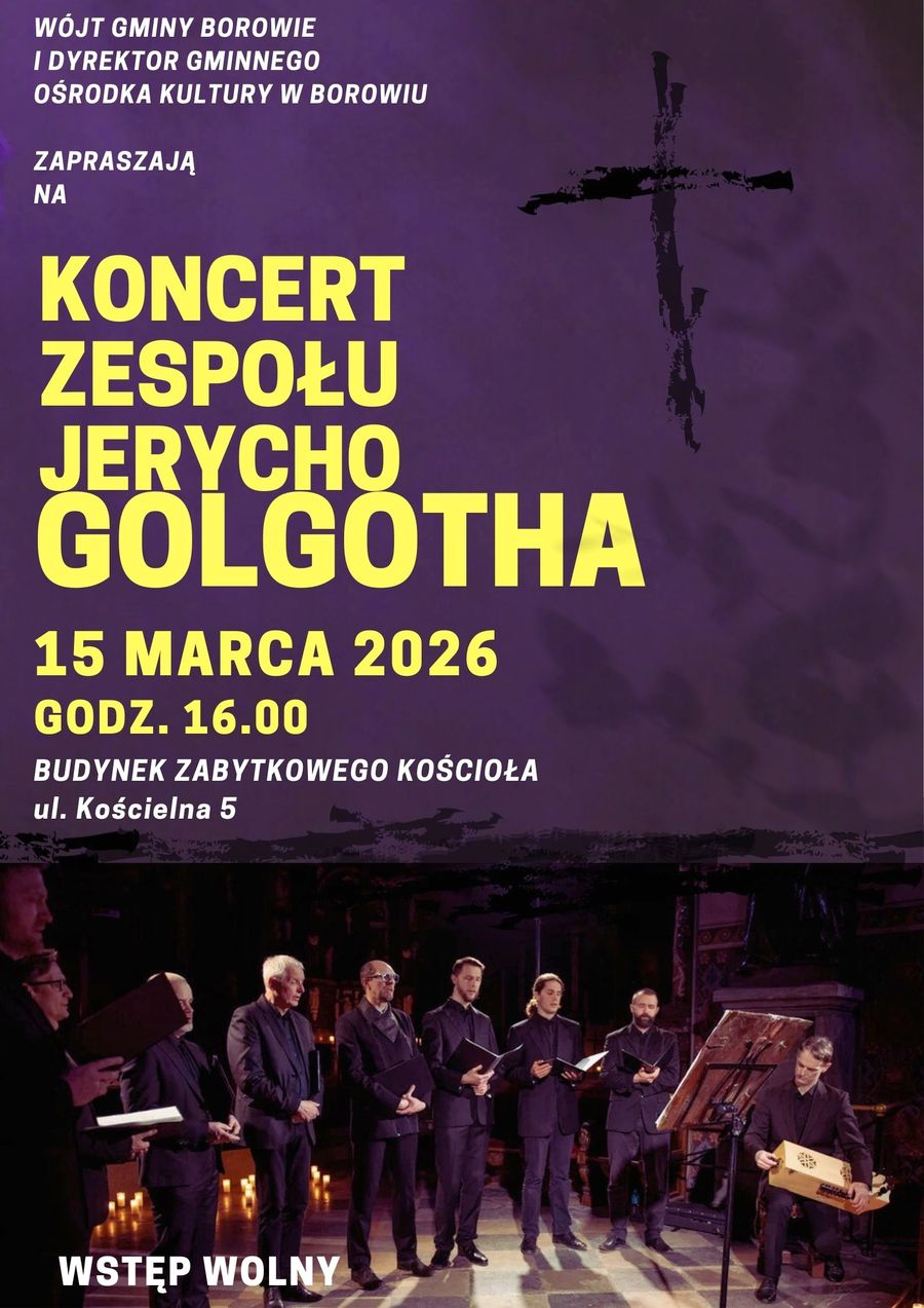 Kolejne wydarzenie kulturalne przygotowuje Gminny Ośrodek Kultury w Borowiu. 15 marca o godzinie 16.00 w zabytkowym kościele odbędzie się koncert zespołu Jerycho zatytułowany „Golgotha”. Organizatorzy zapowiadają wyjątkowe spotkanie z dawną muzyką sakralną oraz chwilę refleksji w czasie wielkopostnego wyciszenia.