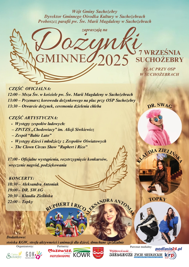 Święto plonów w Suchożebrach odbędzie się 7 września. Rozpocznie się Mszą Świętą dziękczynną o godz. 12:00 w kościele parafialnym, po której wyruszy tradycyjny korowód dożynkowy. Przemarsz zakończy się na placu przy OSP, gdzie zaplanowano oficjalne rozpoczęcie wraz z obrzędem dzielenia chleba.