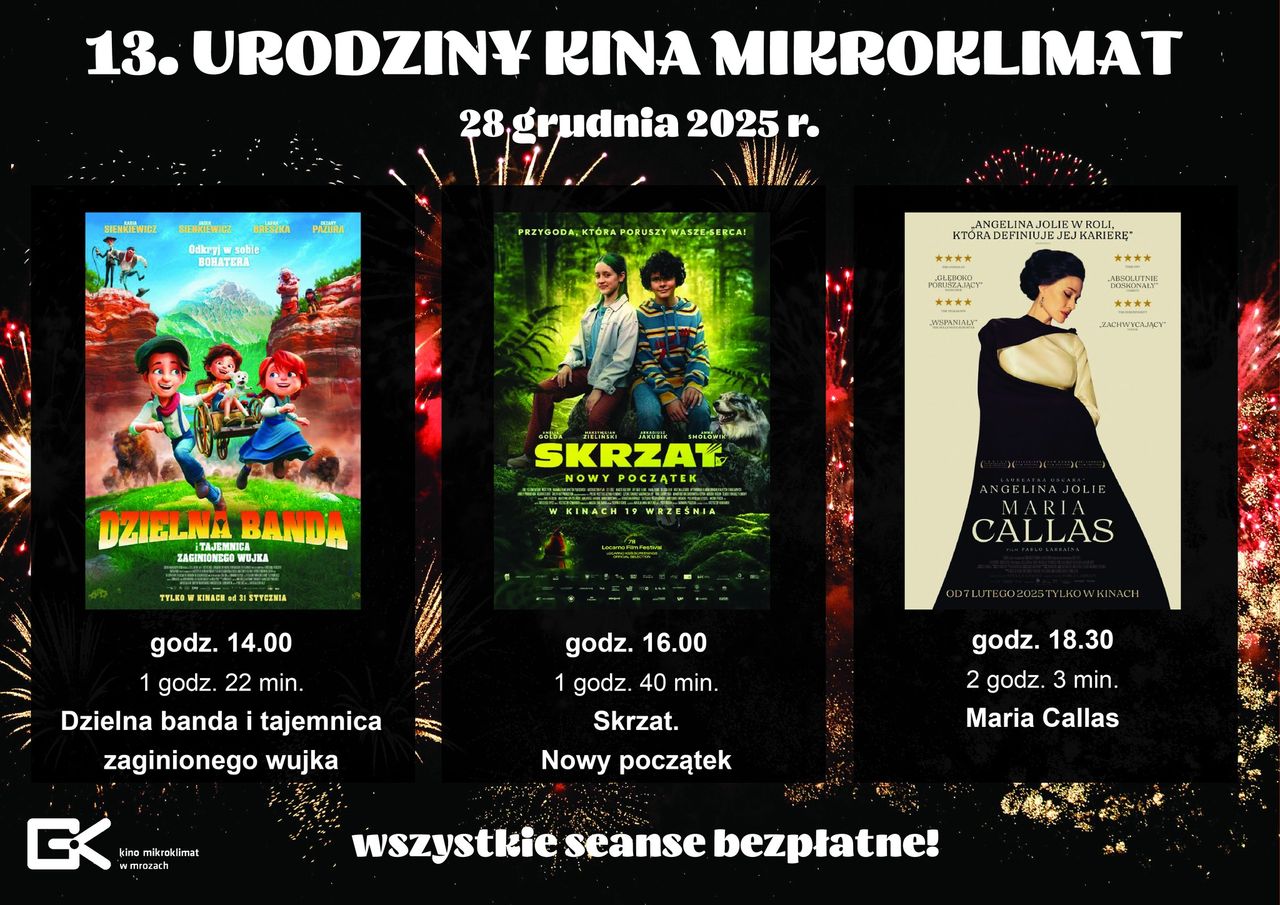 Świętowania urodzin zaplanowano na niedzielę, 28 grudnia. W repertuarze znalazły się filmy zarówno dla najmłodszych widzów, jak i dla dorosłej publiczności. Tego dnia na ekranie Kina Mikroklimat wyświetlane przez całe popołudnie będą następujące filmy:godz. 14.00 – „Dzielna banda i tajemnica zaginionego wujka”. Familijna przygoda pełna humoru i emocji