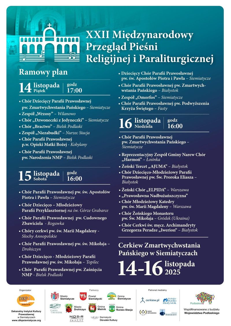 Wszystkie koncerty zaplanowane w dniach 14–16 listopada odbędą się w Cerkwi Zmartwychwstania Pańskiego w Siemiatyczach. Wstęp wolny.