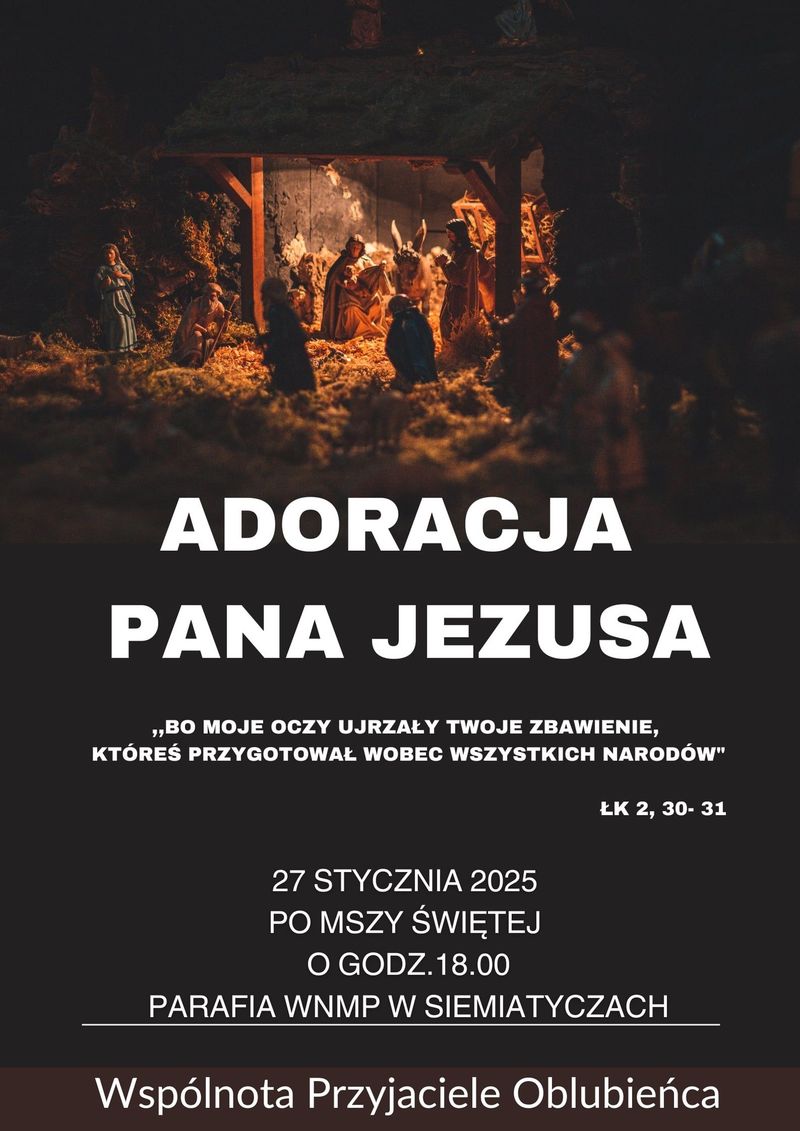 Adoracja w kościele pw. Wniebowzięcia NMP w Siemiatyczach odbędzie się w poniedziałek, 27 stycznia. O godz. 18.00 sprawowana będzie Msza św. wieczorna, następnie adoracja.Tematem przewodnim Adoracji Najświętszego Sakramentu będą słowa „Bo moje oczy ujrzały Twoje zbawienie, któreś przygotował wobec wszystkich narodów.” z Ewangelii według św. Łukasza (Łk 2, 30 – 31).