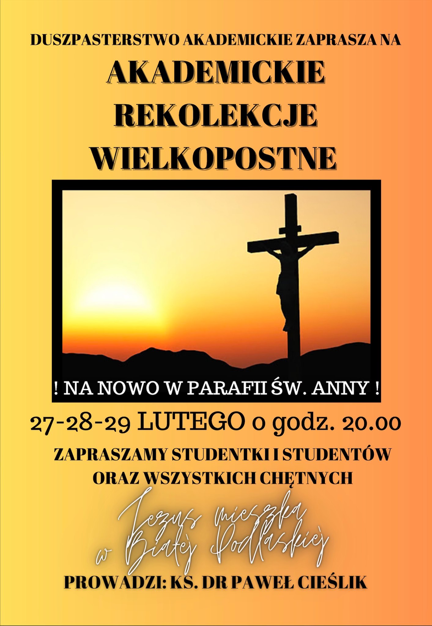 W dniach 27-29 lutego o godzinie 20:00 w kościele p.w. św. Anny odbywać się będą Akademickie Rekolekcje Wielkopostne. Poprowadzi je ks. dr Paweł Cieślik.