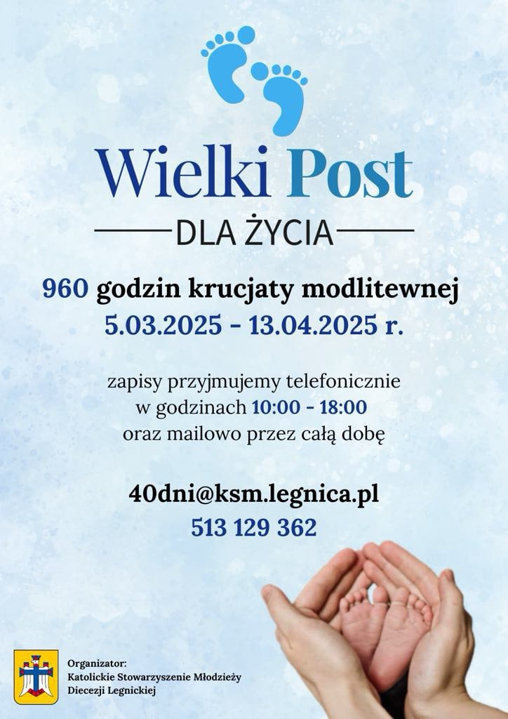 Zachęcamy wszystkich do zaangażowania się w tę modlitewną krucjatę, dając świadectwo wiary i wartości życia ludzkiego. W celu zgłoszenia udziału lub uzyskania dodatkowych informacji, prosimy o kontakt mailowy na adres 40dni@ksm.legnica.pl, telefonicznie pod numerem 513 129 362 (w godz. 10:00–18:00) lub przez formularz kontaktowy na stronie: https://40dni.ksm.legnica.pl/2023/01/02/kalendarz-zapisow-2024/