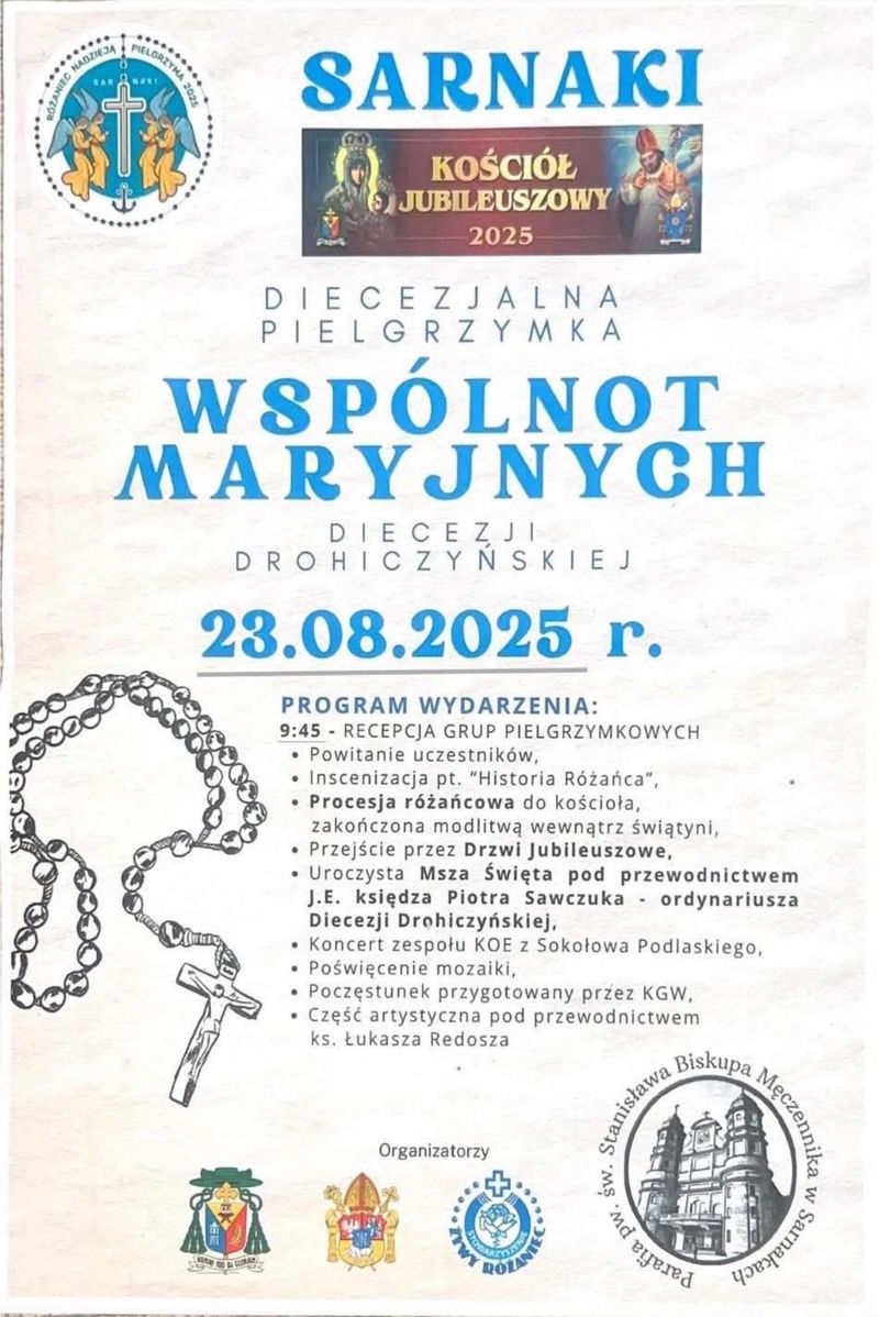 Wszystkie wspólnoty maryjne diecezji drohiczyńskiej zaproszone są na doroczną, Jubileuszową Diecezjalną Pielgrzymkę, która odbędzie się w sobotę, 23 sierpnia w Sarnakach, w parafii św. Stanisława Biskupa i Męczennika.Rejestracja grup pielgrzymkowych rozpocznie się o godz. 9.45. Msza Święta o godzinie 12.00 w kościele parafialnym, której przewodniczyć będzie biskup drohiczyński Piotr Sawczuk.