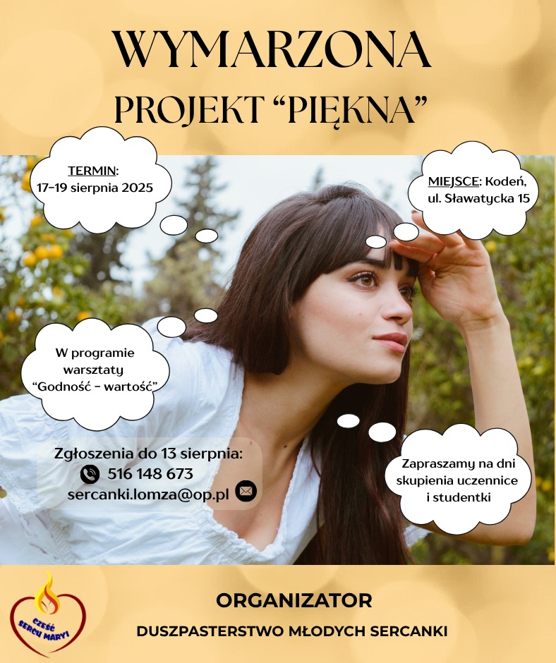 Siostry Sercanki zapraszają uczennice i studentki na wyjątkowe dni skupienia, które odbędą się w dniach 17–19 sierpnia w Kodniu (ul. Sławatycka 15). Spotkanie zatytułowane „Wymarzona – Projekt Piękna” będzie okazją do głębszego poznania siebie i odkrywania kobiecego piękna na wzór Maryi.