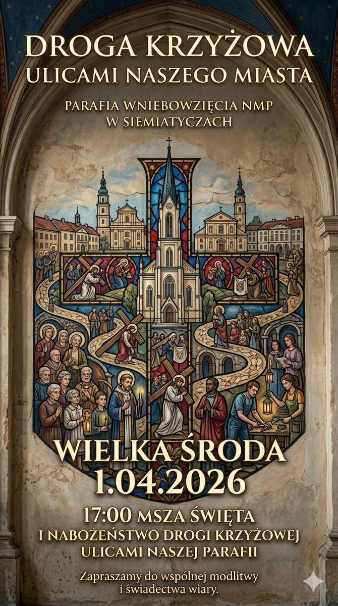 W środę, 1 kwietnia odbędzie się Miejska Droga Krzyżowa, która wyruszy z kościoła Wniebowzięcia NMP o godz. 17.30. Bezpośrednio przed nią, o godz. 17.00, sprawowana będzie Msza Święta, stanowiąca duchowe wprowadzenie do dalszej, wspólnej modlitwy.Parafianie, mieszkańcy Siemiatycz oraz goście są zaproszeni, aby w atmosferze skupienia i modlitwy zjednoczyć się wokół krzyża, rozważając mękę i śmierć Chrystusa oraz dając świadectwo swojej wiary w przestrzeni publicznej.