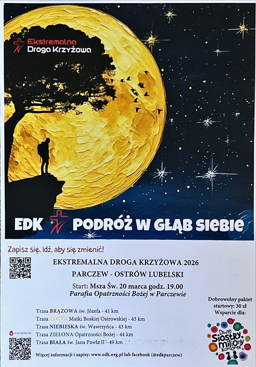 Tegoroczna Ekstremalna Droga Krzyżowa w Parczewie odbędzie się w piątek, 20 marca. Rozpocznie się, jak zawsze, Mszą świętą o godz. 19.00 w parafii Opatrzności Bożej. Po Eucharystii uczestnicy wyruszą na wybrane trasy. W tym roku przygotowano pięć tras o różnej długości i stopniu trudności, tak aby zarówno osoby rozpoczynające swoją przygodę z EDK, jak i doświadczeni piechurzy mogli znaleźć odpowiednie wyzwanie.Każda z tras prowadzi do Parafii Niepokalanego Poczęcia Najświętszej Maryi Panny w Ostrowie Lubelskim, która będzie miejscem zakończenia nocnej wędrówki.