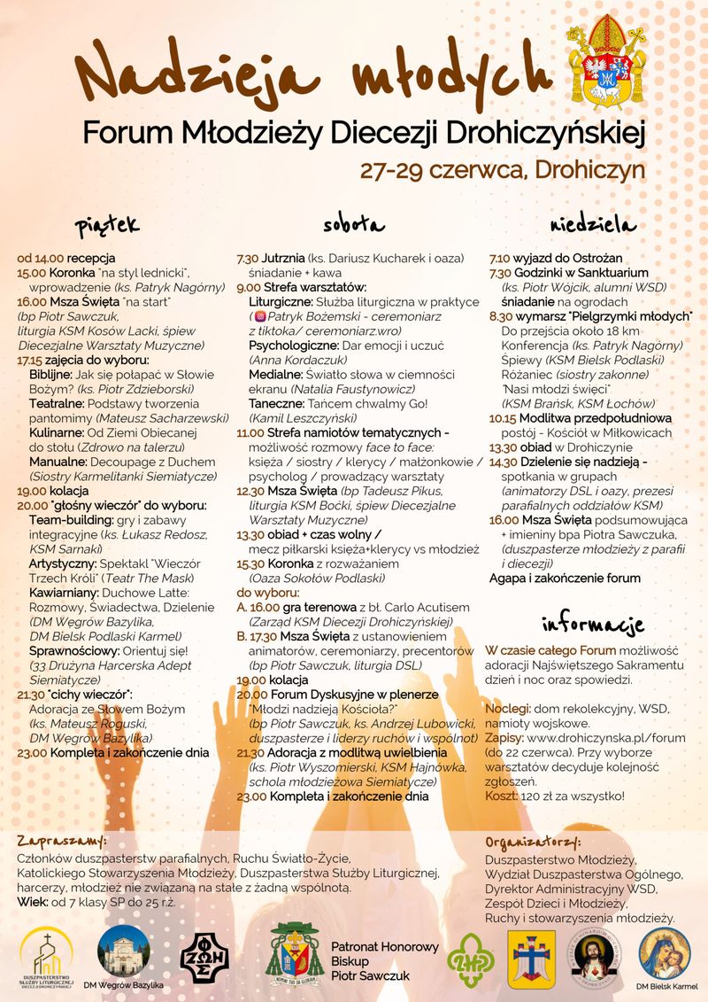 Podsumowaniem Forum będzie piesza pielgrzymka z Ostrożan do Drohiczyna (15 km) – jako znak, że idziemy razem jako Kościół młodych ludzi pełnych nadziei.
