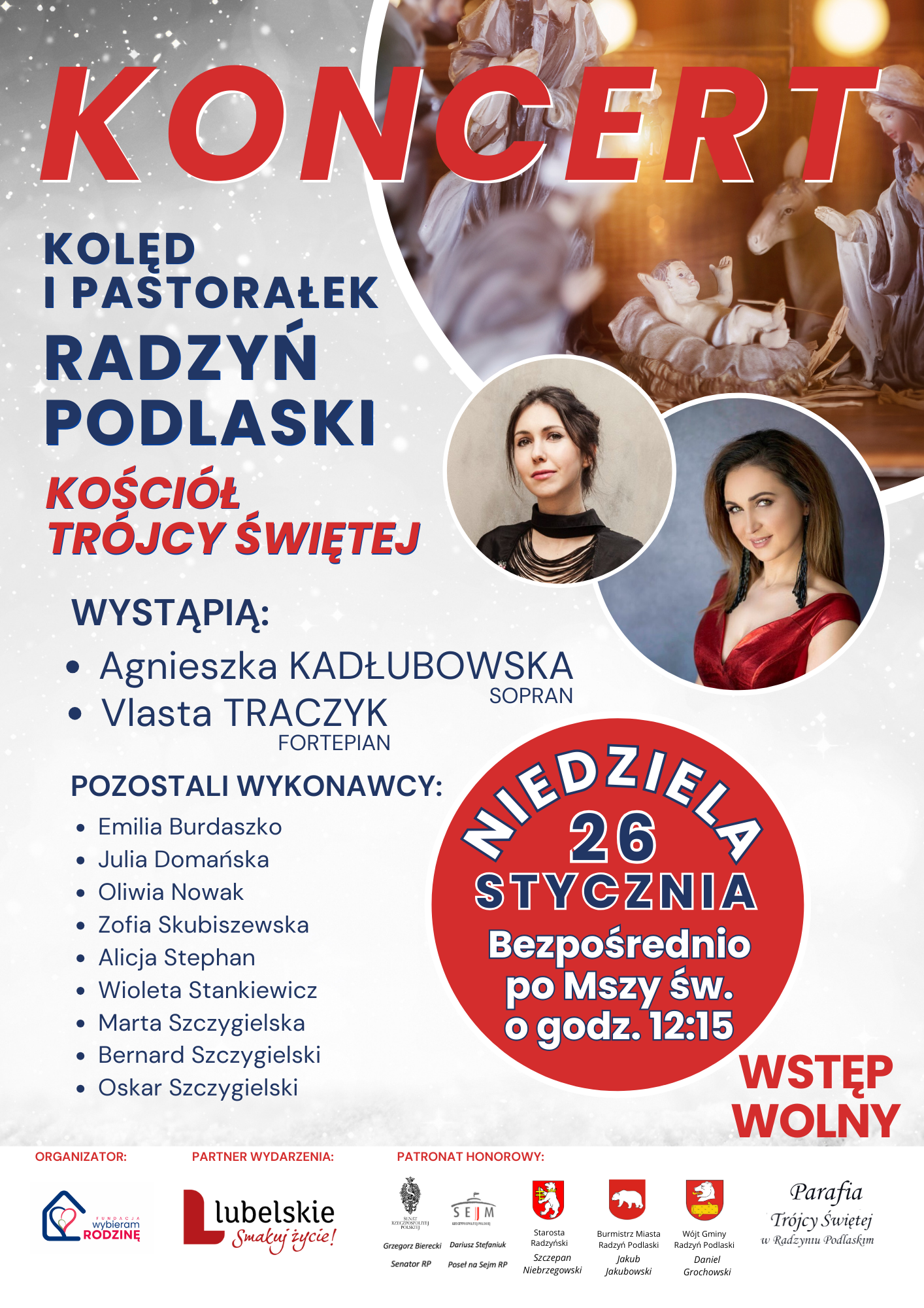Artystkom towarzyszyć będą również uczestnicy zajęć warsztatowych prowadzonych przez śpiewaczkę. Koncert odbędzie się 26 stycznia w kościele Trójcy Świętej w Radzyniu Podlaskim bezpośrednio po Mszy świętej, która jest sprawowana o godz. 12:15.- Wierzymy, że wydarzenie to przyczyni się do wzmocnienia więzi i większej integracji rodzin z naszego terenu. Koncert jest okazją do wspólnego, rodzinnego kolędowania, przez co kultywowana jest narodowa tradycja. Wstęp na wydarzenie jest bezpłatny - informują organizatorzy.