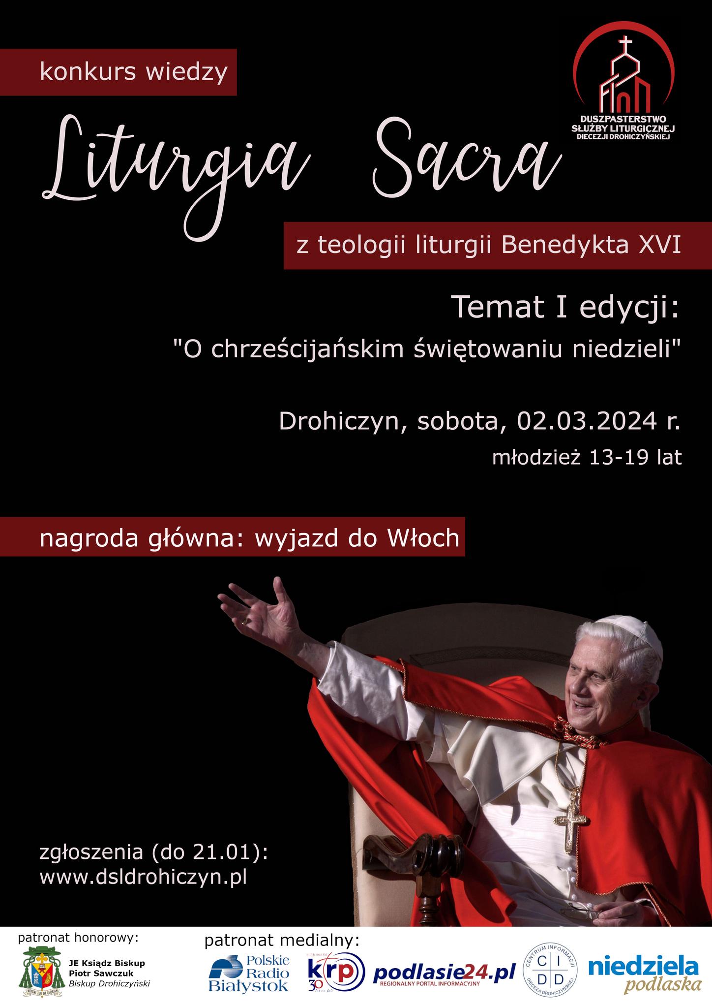Diecezjalne Duszpasterstwo Służby Liturgicznej Diecezji Drohiczyńskiej organizuje konkurs wiedzy liturgicznej „Liturgia Sacra”, który promuje myśl zmarłego niedawno papieża Benedykta XVI - jednego z największych teologów XX wieku. Konkurs skierowany jest do uczniów w wieku 13-19 lat.