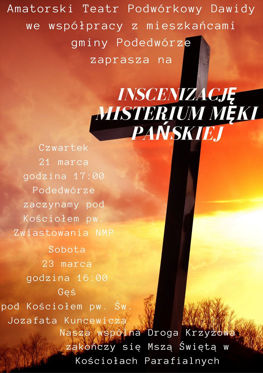 Amatorski Teatr Podwórkowy Dawidy we współpracy z mieszkańcami gminy Podedwórze przygotował inscenizację Misterium Męki Pańskiej. W ramach tej współpracy odbędą się dwa spektakle. Pierwszy w czwartek, 21 marca, o godzinie 17.00 w Podedwórzu. Inscenizacja rozpocznie się przy kościele Zwiastowania Najświętszej Marii Panny, a zakończy na terenie kościoła Podwyższenia Krzyża Świętego.