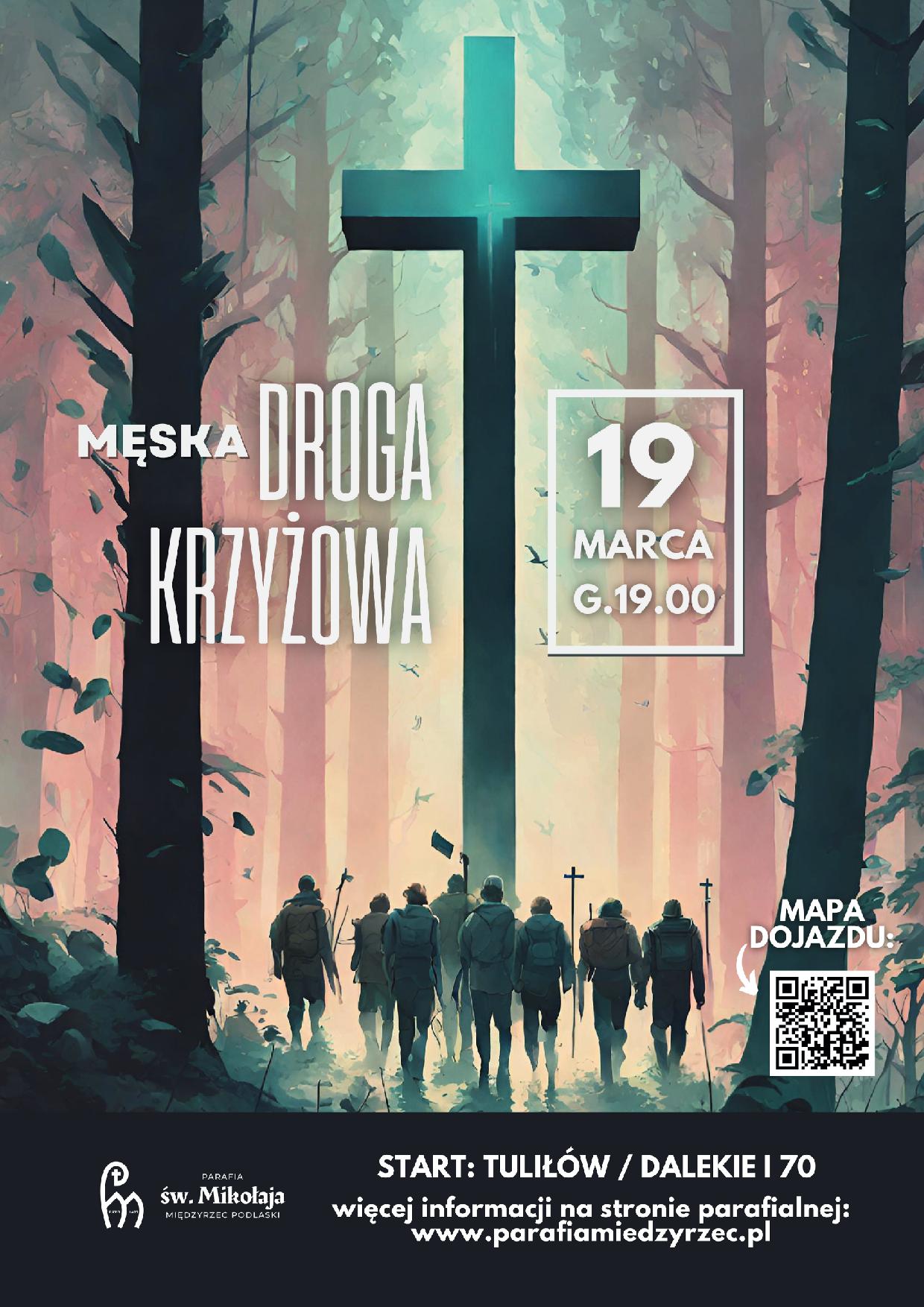 Nocna Droga Krzyżowa Mężczyzn, odbędzie się 19 marca w Tuliłowie ul. Dalekie I 70. Rozpocznie się o godzinie 19.00. Na plakacie podany jest kod QR z geolokalizacją.