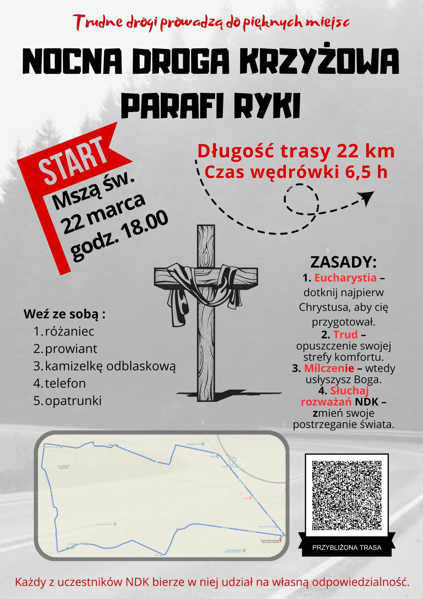 Nocna Droga Krzyżowa w Rykach rozpocznie się mszą świętą o godzinie 18:00 w Parafii pod wezwaniem Najświętszego Zbawiciela. Uczestnicy powinni mieć ze sobą różaniec, prowiant, kamizelkę odblaskową, naładowany telefon i opatrunki.NDK jest okazją, aby rozważyć swoje życie i zbliżyć się do Boga. Każdy z uczestników bierze udział w modlitewnej wędrówce na własną odpowiedzialność.